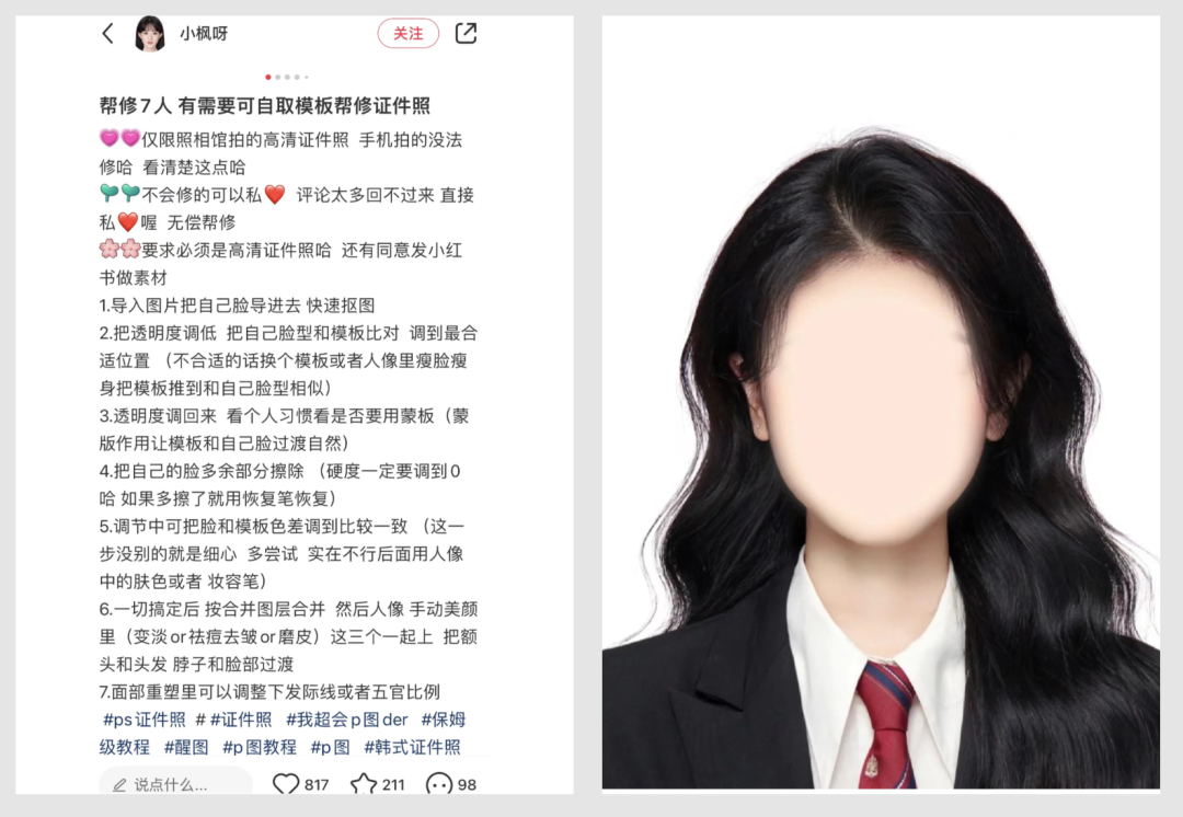 一方面是“最美证件照”的质量堪忧且极易被取代。既然照相馆靠修图、靠左眼复制粘贴右眼,那预算不足的打工人也可以直接自己来,或是花点钱去找个P图服务,无痛省时“贴脸”。