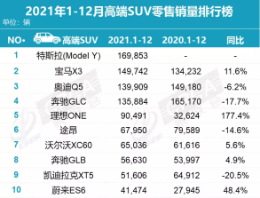 高端SUV市场中,宝马X3、奥迪Q5,奔驰GLC排名依旧靠前,特斯拉Model Y首次上榜且排名第一,理想ONE和蔚来ES6仍保持位列榜单,但理想ONE排名较2020年显著攀升3个名次。