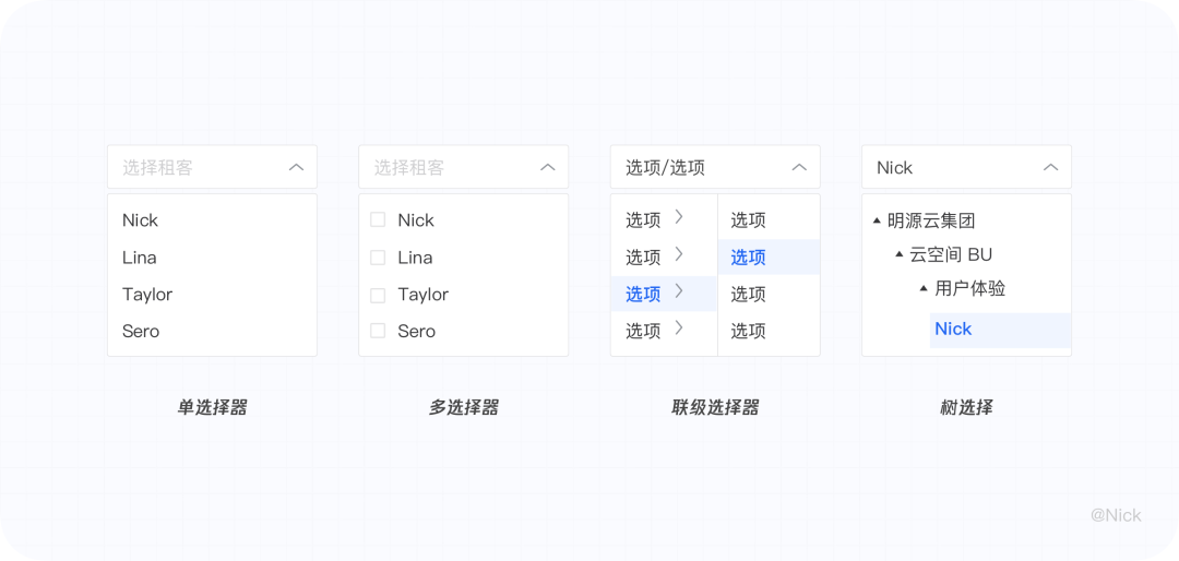 适用场景:适用于选项个数较多的场景(一般多于5项);适用于推荐使用默认选项的场景;适用于选项中存有大量相似的选项的场景。