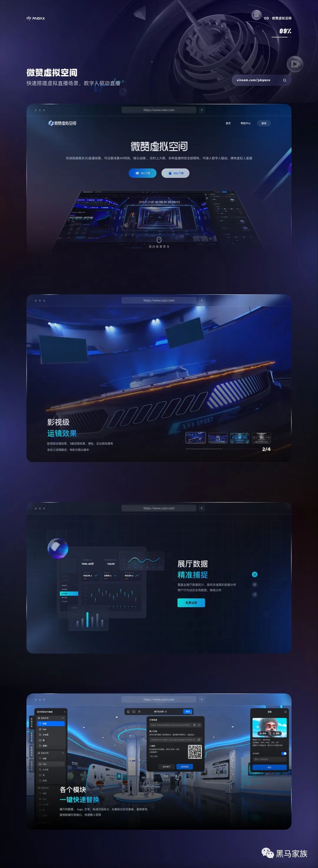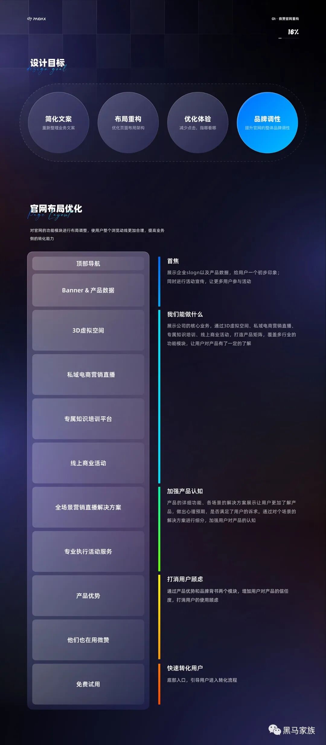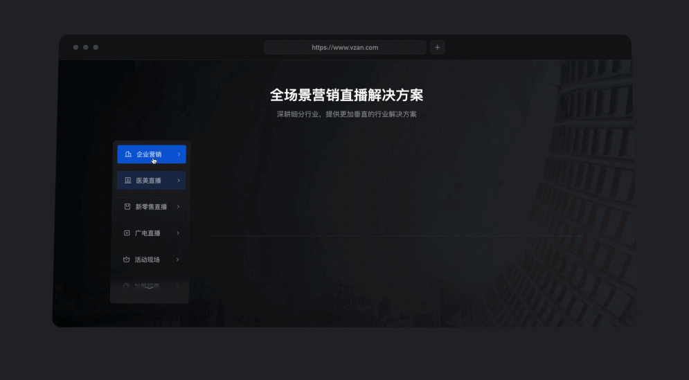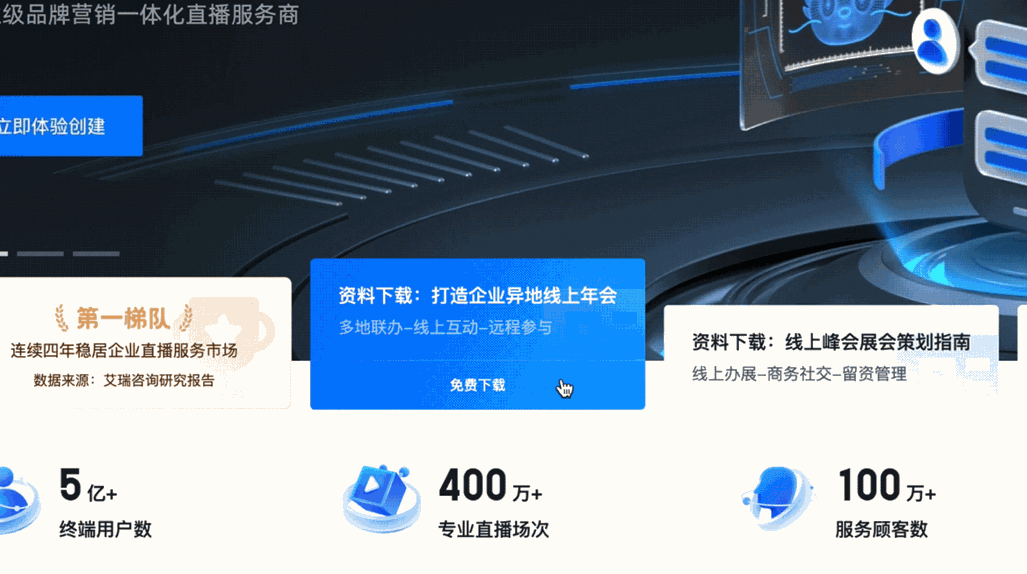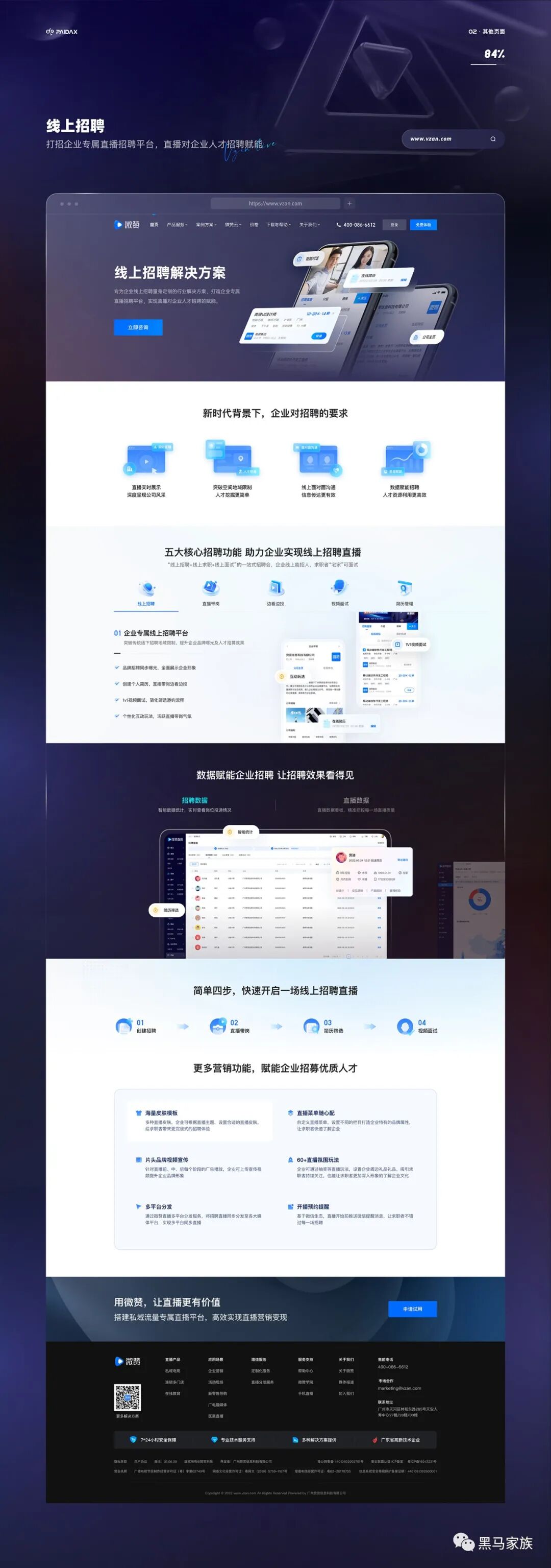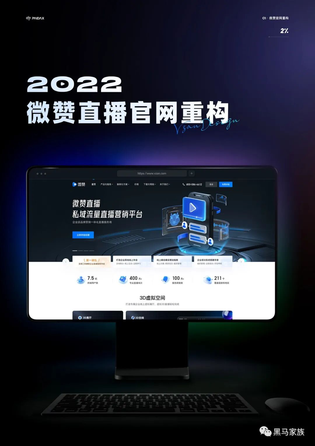 这是22年3月份的时候做的重构,从入职到现在就一直在负责微赞直播官网的设计,基本每一年都会有一次重构,每次与需求方对接碰撞中,去梳理业务逻辑以及业务方向是一件很有意思的事情,在每次重构的探索中,慢慢形成了契合业务的设计风格。