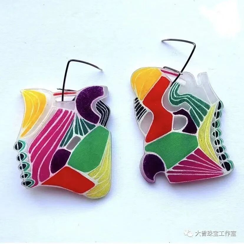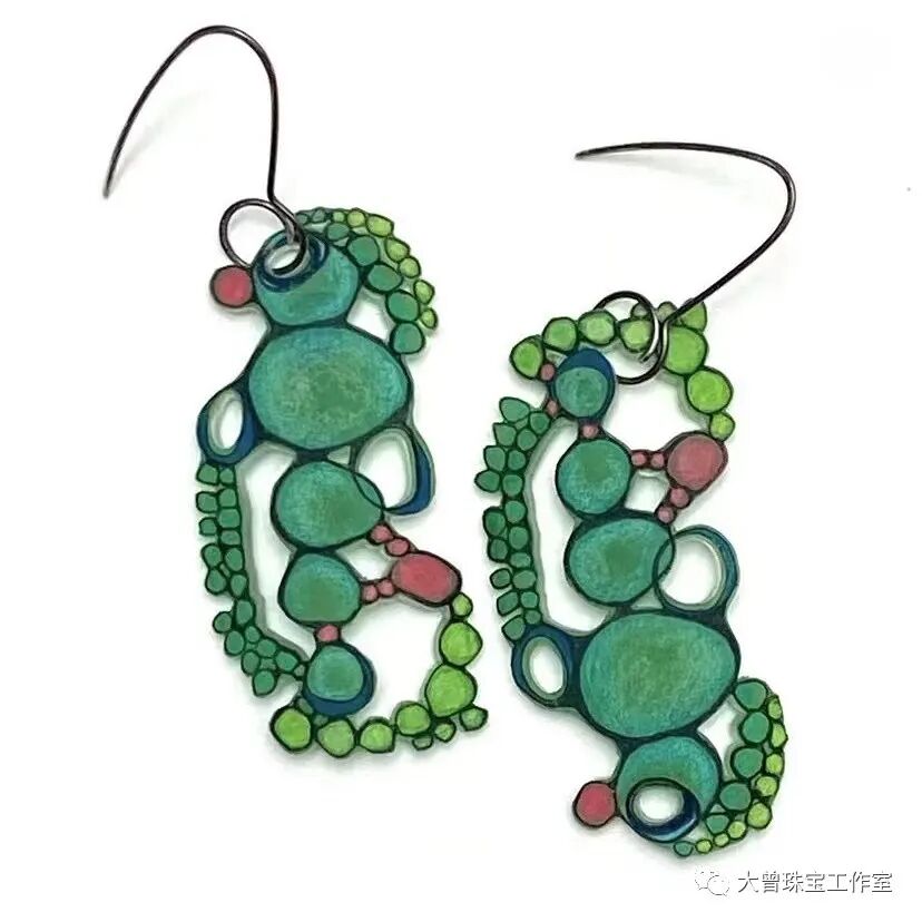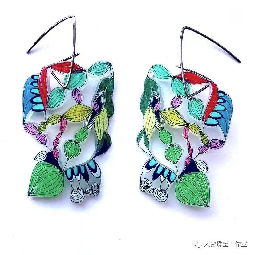 用彩色铅笔绘制的精致收缩塑料插图制成的耳环和吊饰。她在几年前才开始出售她的工艺品。她做了一个君主级蝴蝶的耳环,并戴着它去她做酒保的平民餐厅工作。在收到许多对耳环的赞美后,她决定制作更多的耳环,在康科德艺术市场上出售。