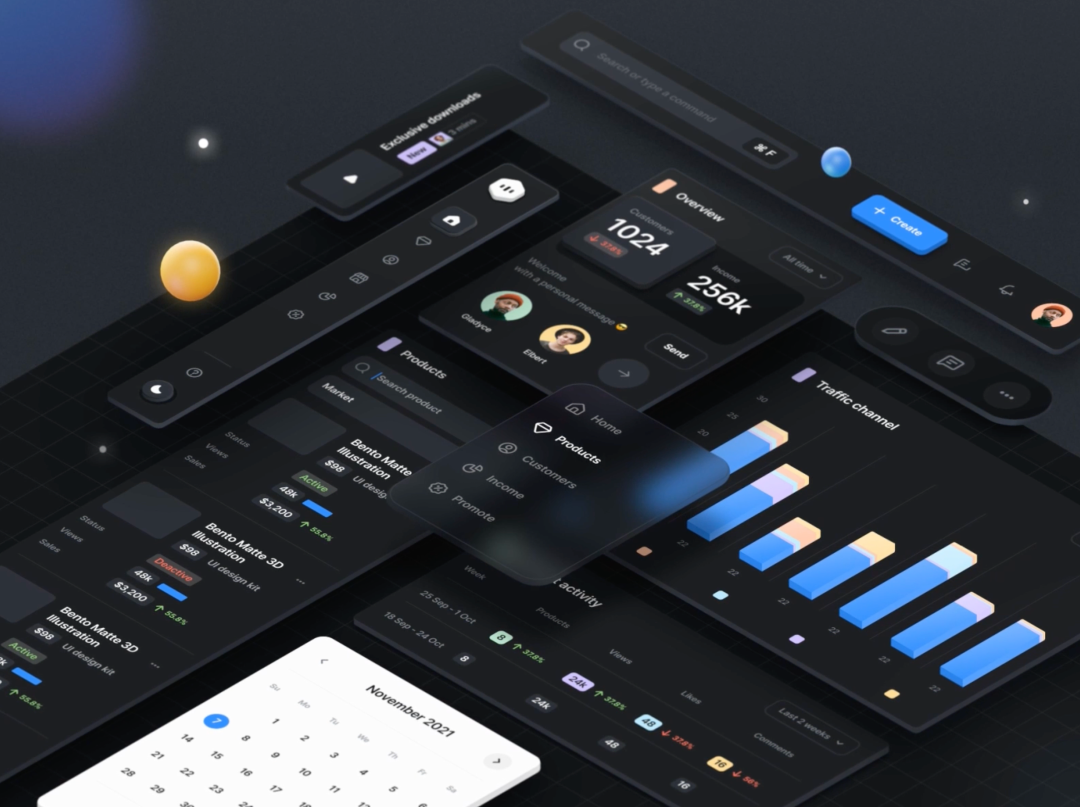把界面增加3D厚度后,再稍微加一些比较轻量的3D装饰元素,常用的有小球、方块等3D元素能让画面效果更好。