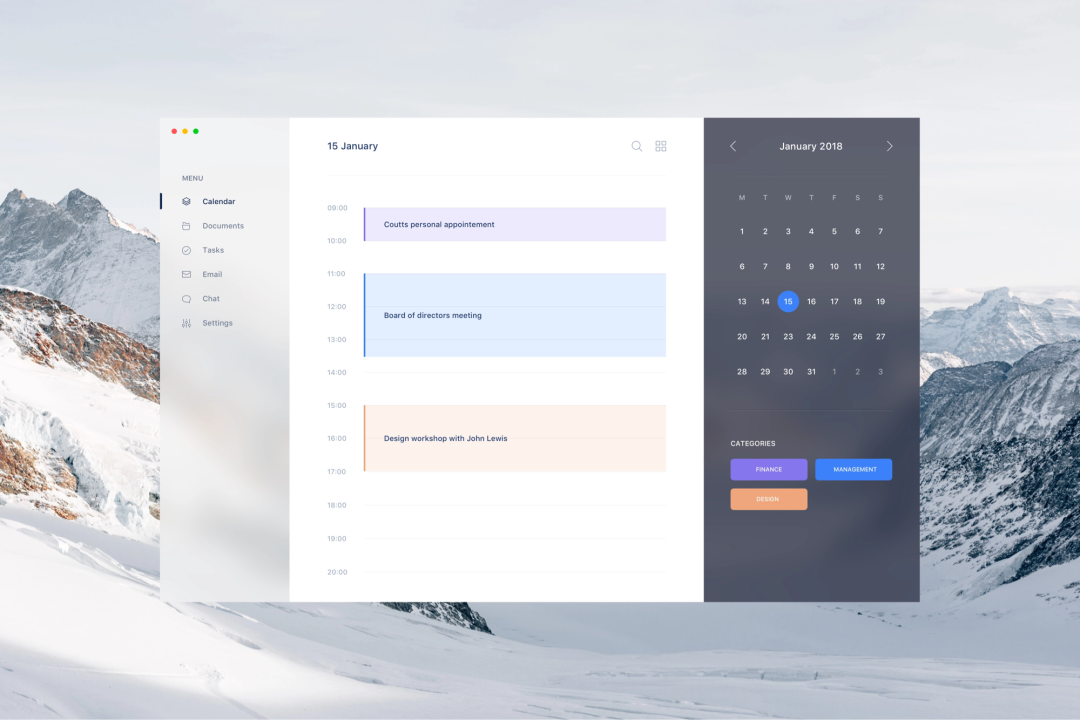 比如这张图,细节点在于界面左边浅色配上底图中左边的白,右边深色界面搭配右边深色的山体颜色,看起来就很和谐。