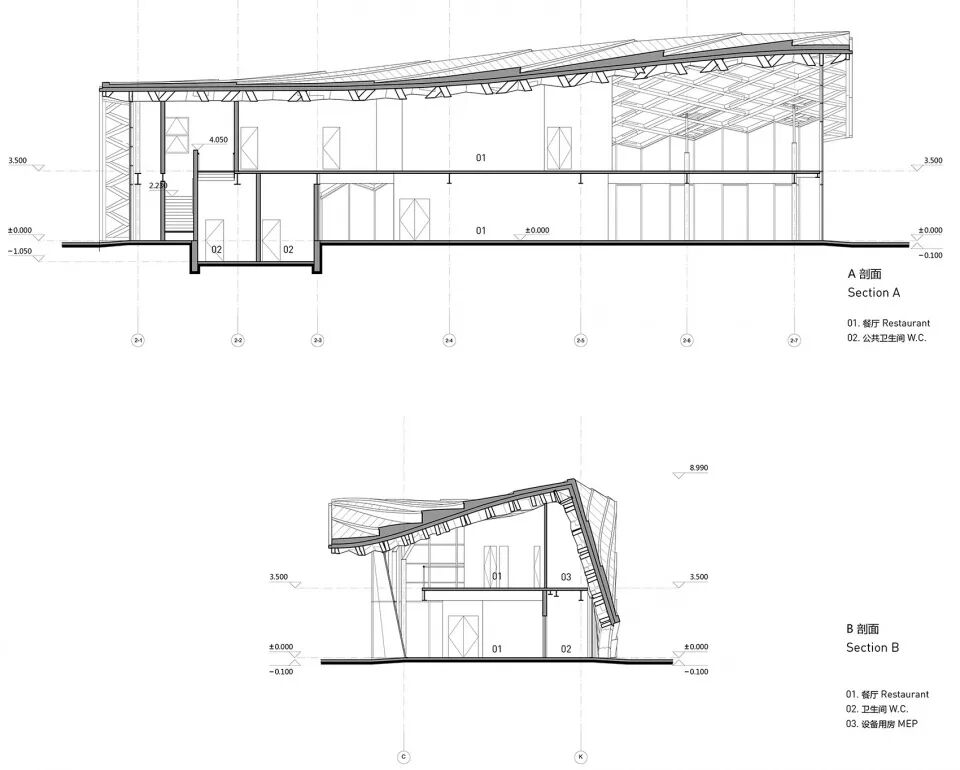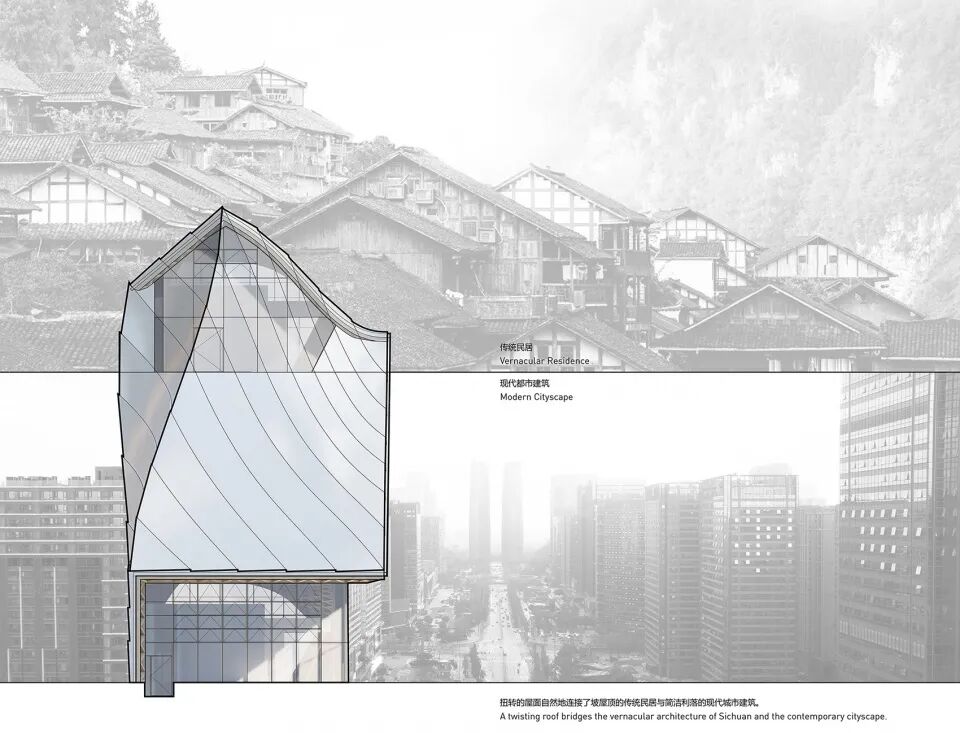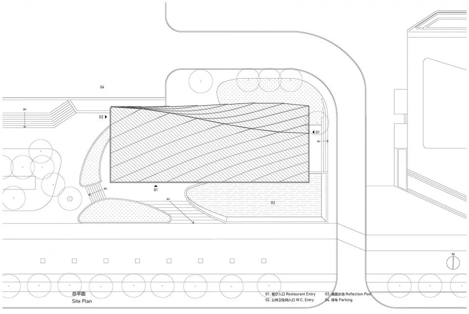 建筑的量体希望建立起坡屋顶的传统四川民居与简洁利落的现代城市之间的对话。餐厅东立面延续了四川传统木结构建筑倾斜的屋顶轮廓与立面肌理,西立面衔接了交子大道周边方整的建筑语汇。两者迥异的形体由一个扭转的屋面自然地连接在一起。屋面的轮廓轻如羽翼,动态起伏的双曲面顺着蜿蜒的屋脊线延展,轻盈地覆盖着下部的餐厅与景观,给予用餐的人们自由奔放、充满动感的空间氛围。