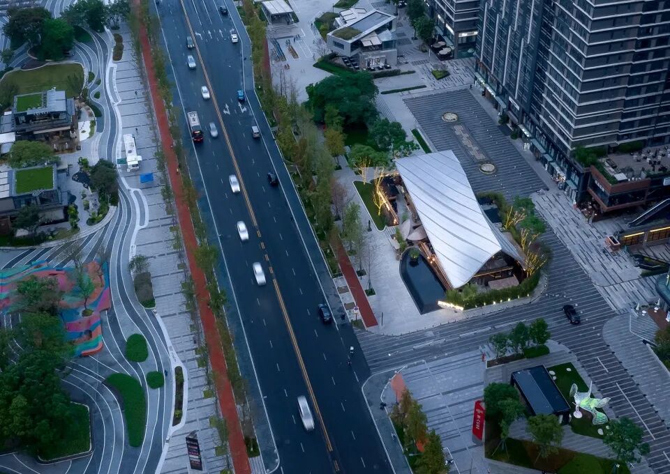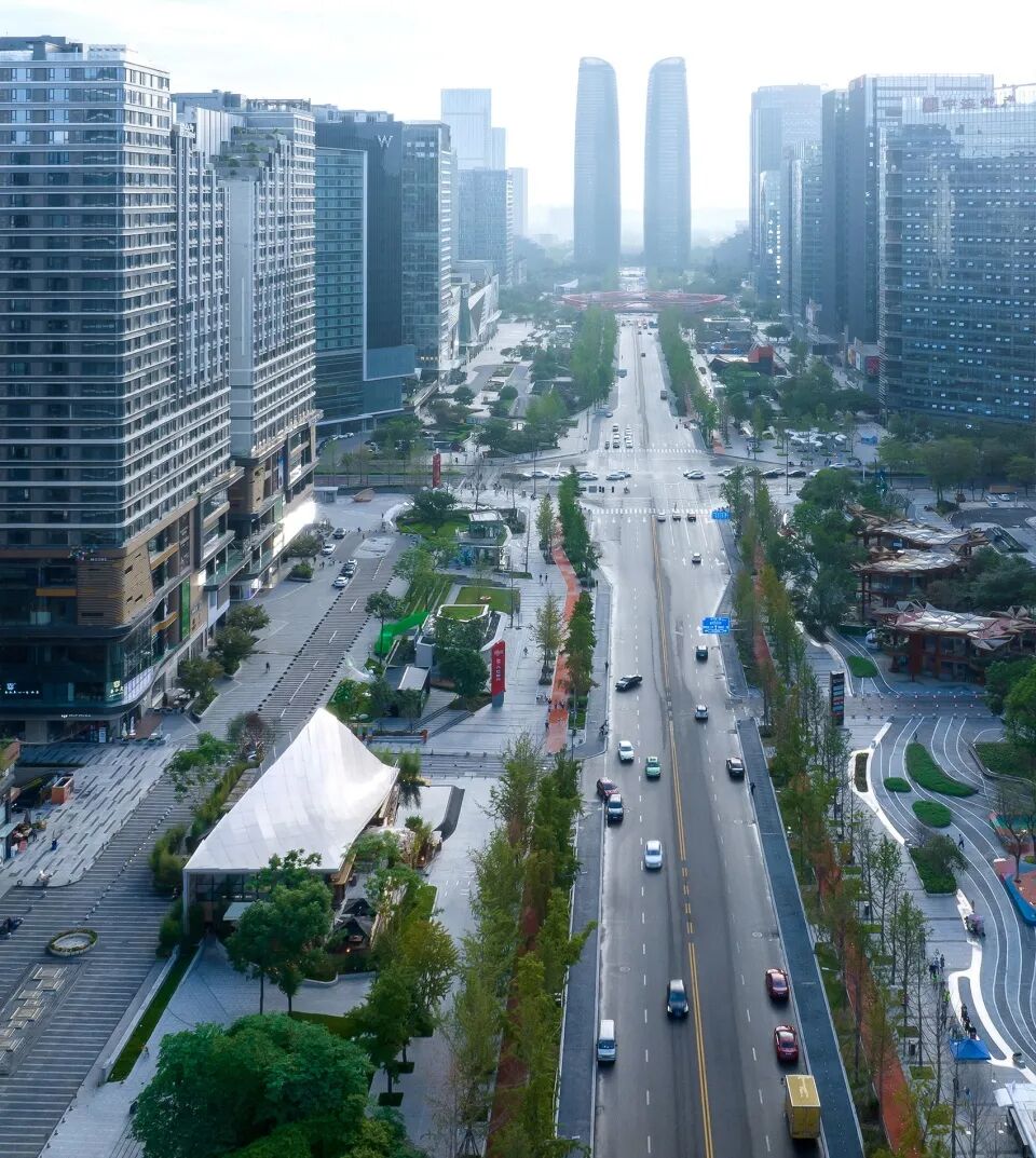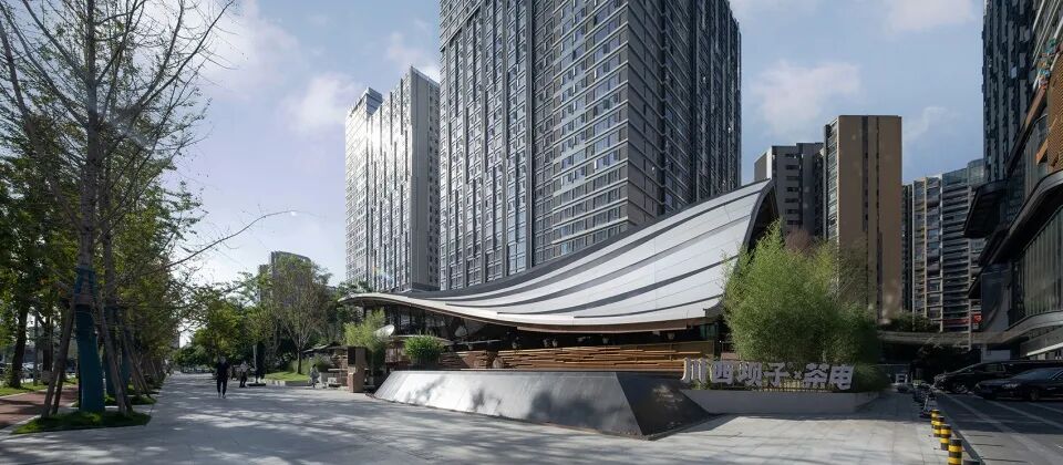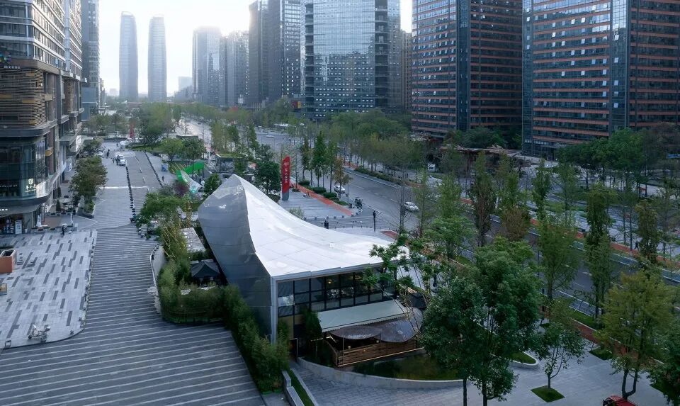 成都交子大道是一条两公里长东西向的林荫道,两侧各有约50米宽的人行景观空间,其中散布着二十余个规模几百平米不等的服务驿站,本案即为位于N4-3地块的餐饮建筑。