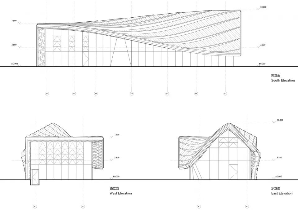 建筑立面设计尽可能的通透以突出木结构在室内外的连续感受。南北侧的玻璃幕墙呼应了屋顶木梁的走向,自然而然地形成了连续转折的动态轮廓。在室内灯光的照亮下,街上的行人可以从外侧透过玻璃清晰地看到整个木屋顶。