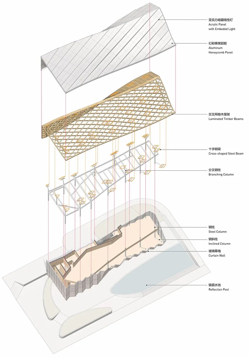 建筑的结构为钢木混合结构。斜向交叉的网格状胶合木木梁顺应双曲面形体排布,由室内一路延伸至檐口,形成了人工建构的自然与室外绿意的对话。为了增加稳定性,钢柱在二层楼板以上分叉,并以十字型钢梁搭接到木屋顶两个网格的中心点,形成树枝般的结构构件。