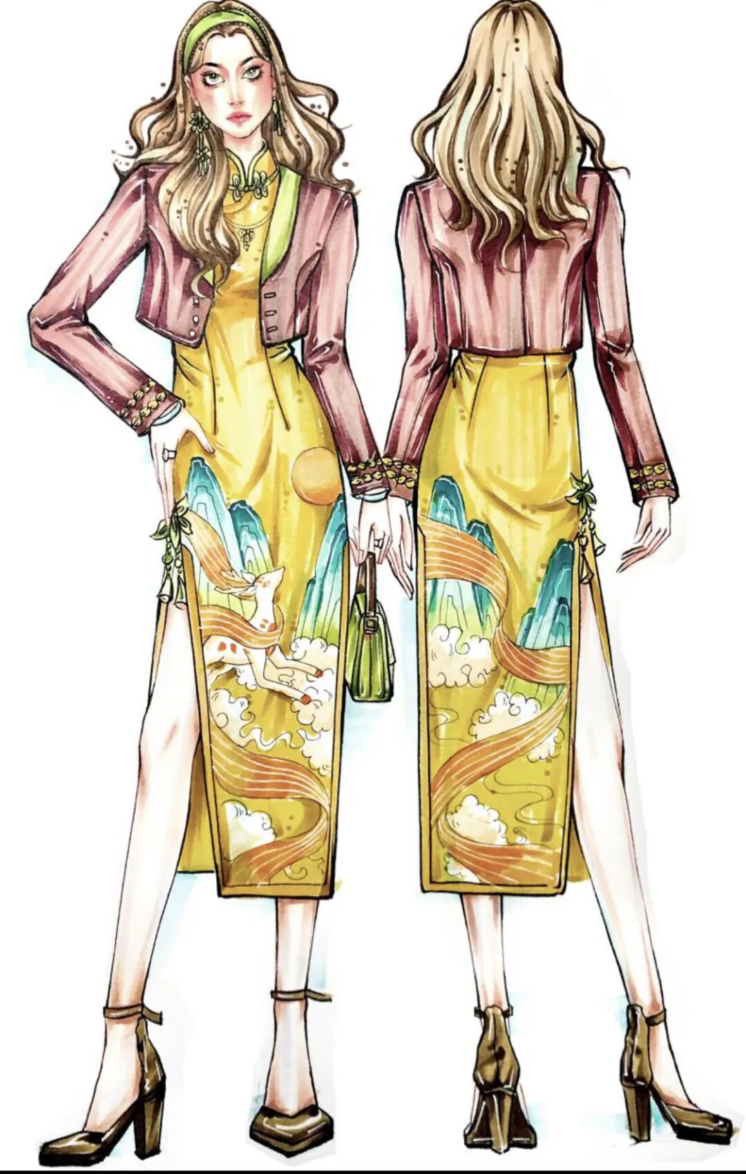 第一、人体动态可以进行变化。跳出单一的走姿形态,寻找一些生动的站姿也是很有效果的,但可不是就直接站在那里的人体。扭胯、叉腰、如何站立都是可以去设计的,当然如果选择一个较难的人体作为你定稿的基础,必须要勤加练习。如果是双人构图的画可以有一些互动。第二,头部进行风格画处理,五官形态、发型、耳饰等等都可以进行一定的变化,参考一些插画作品进行临摹和更改,形成自己的风格。第三、勾线方式要跳出常规,层次一定要分明,勾线不能死板。第四是颜色部分,尽量不要颜色单调上衣下衣都是一个颜色还没有图案,多使用一些明亮但不鲜艳的颜色,在细节的地方运用对比色,让你的画面突出,另外图案也非常重要,多去搜集一些素材,推荐去找一些国风的图案,这几年北服考察中式元素的内容也比较多,动物、植物都可以准备一些,不需要太难但不要太单一,加一些装饰元素更能使画面看起来丰富一些,必须去仔细的画,一定要将图案勾线,这就导致时间上会非常来不及,就需要每天去练,画的多了速度也就提上来了。