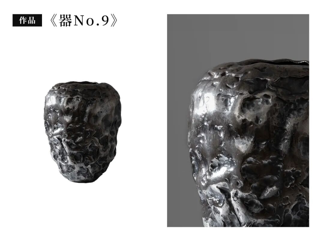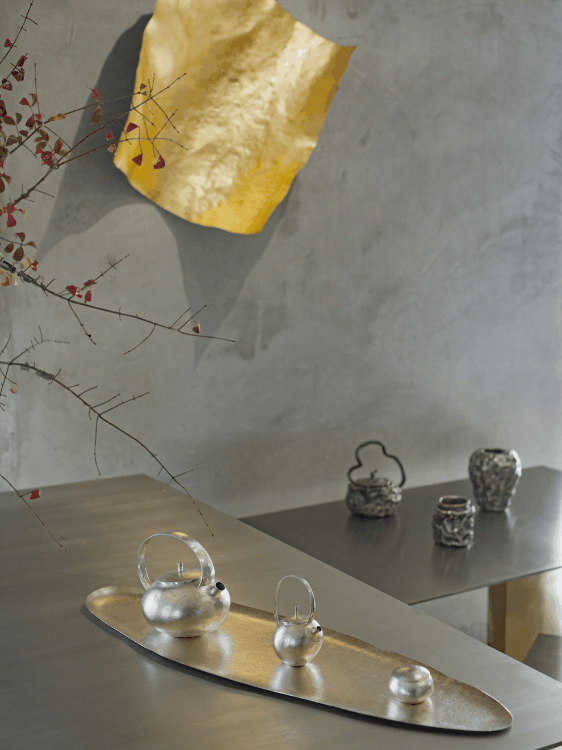 刚毕业的时候,他研究了中国的美术史,寻找、整理东方的器型和图式,创作了龙纹银壶、莲花香钵,借鉴了国画的表现手法,随机的锻打技法就像国画里的泼墨。