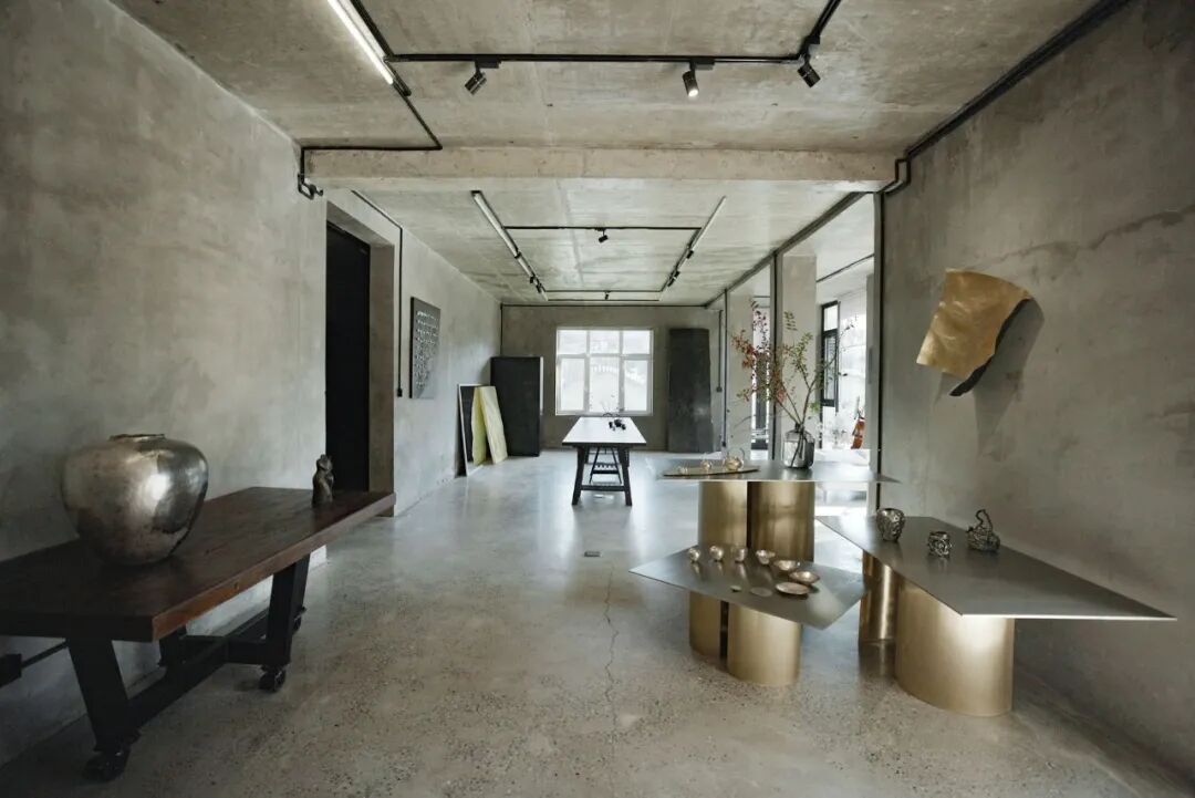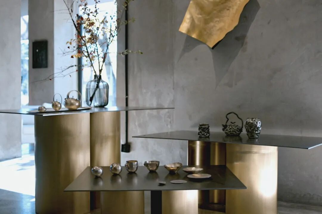 靠近玄关的一组展示桌,是夫妇俩一起设计的。挑选了不锈钢、黄铜,采用手打和砂轮机组合的方式制作。男方负责“抡大锤”,女方调整细节,做出了金银色与黑色两种,取名《昼夜》。