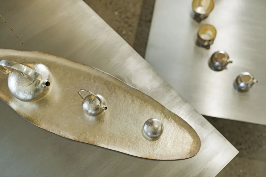 2014年左右,汪旺开始思考对“人、器物与工艺”之间的内在哲学关系。《器》系列成了他最主要的作品,汪旺几乎从不预先画设计稿,而是遵循一把壶的基本功能,在制作过程中随机应用金、银和铁,最后的造型总是超乎他的想象。