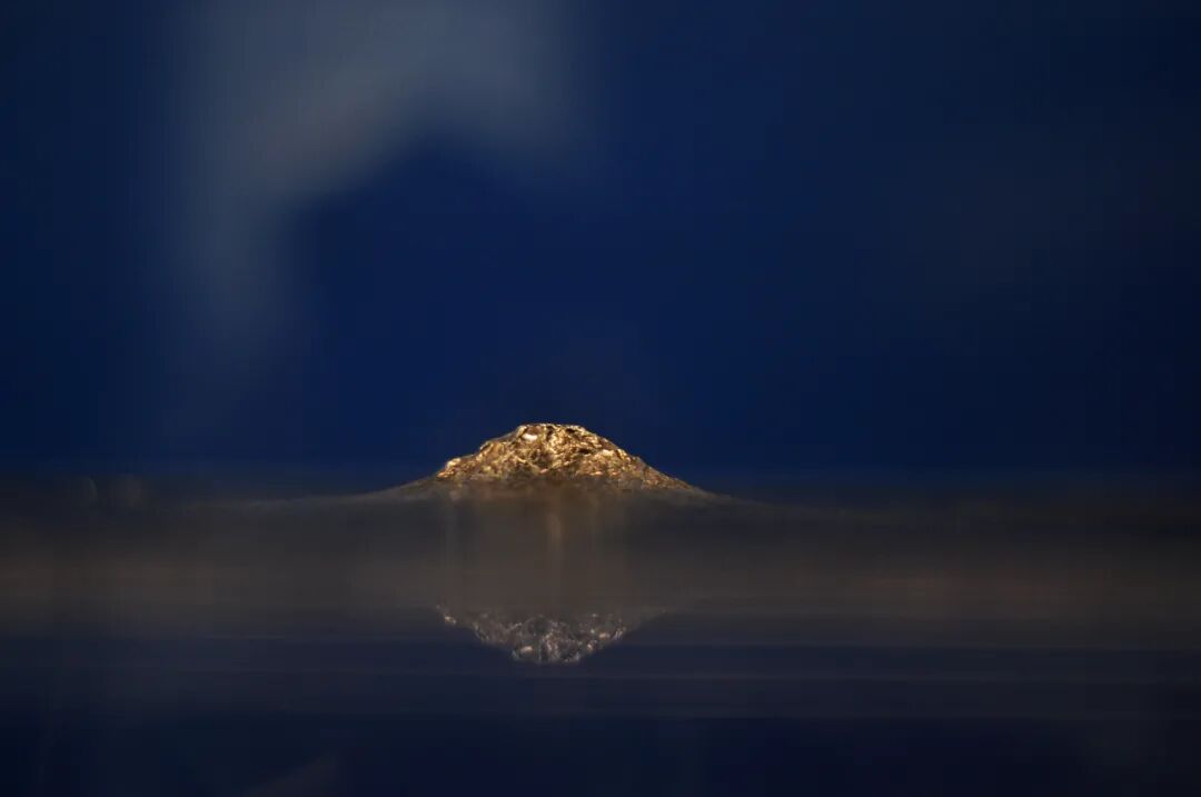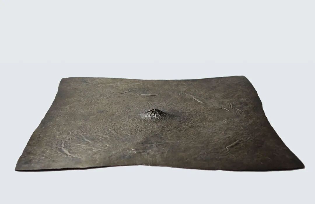 汪旺创作了一件观念性的金工作品:《300万次的海拔》。他在一块2毫米厚的银片上不断捶打了几个月,让银料向中心层层堆积,最后形成26毫米高的隆起。完全靠纯粹的传统工艺,却表达出非常国际化的艺术语言。