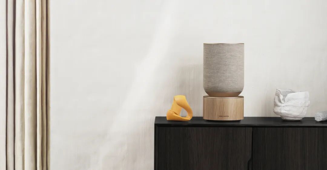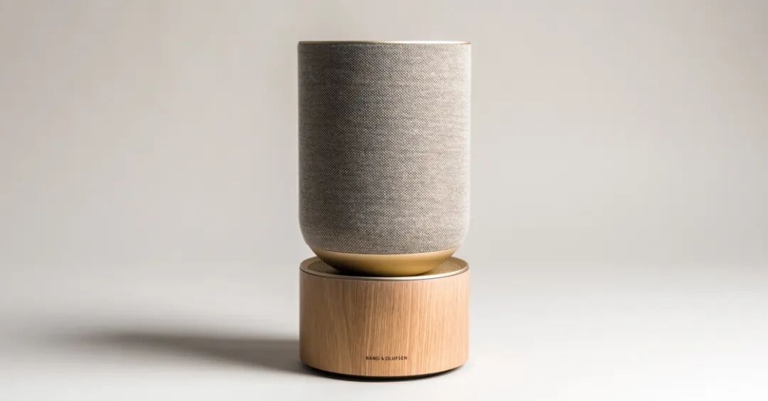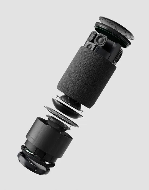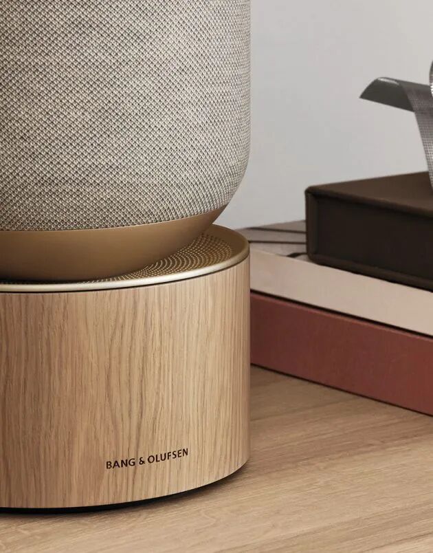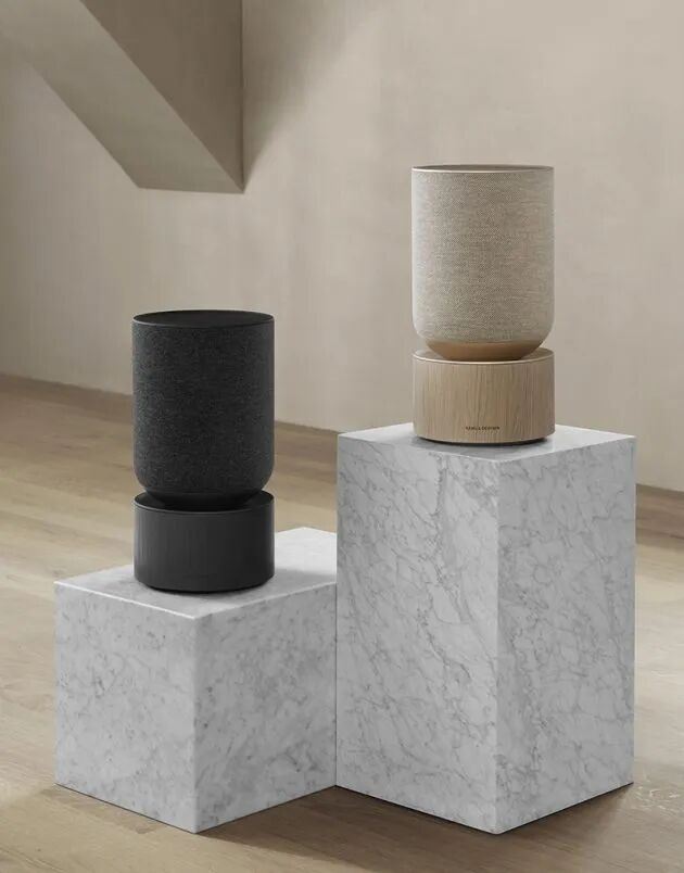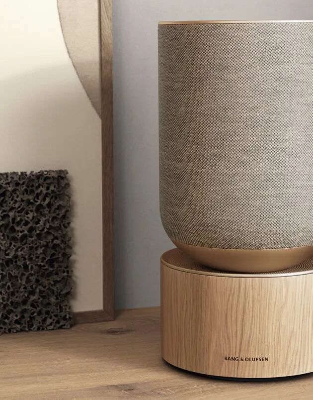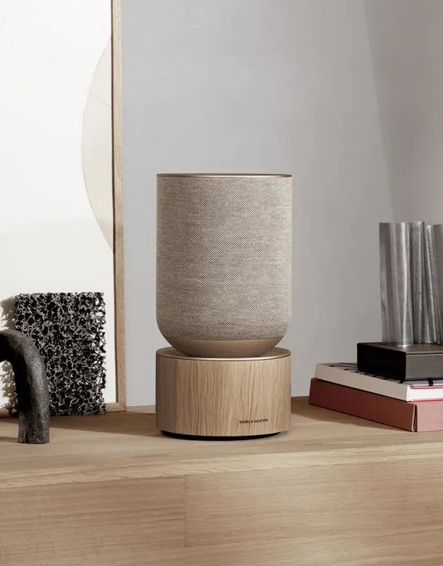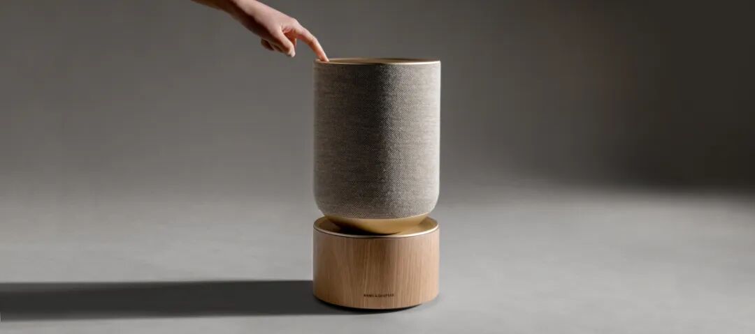 BEOSOUND BALANCE 是一款高性能的扬声器设计,木材底座支撑着纺织品覆盖的圆柱形扬声器,顶部带有直观的触摸和语音激活界面,也像是一件家庭艺术品。