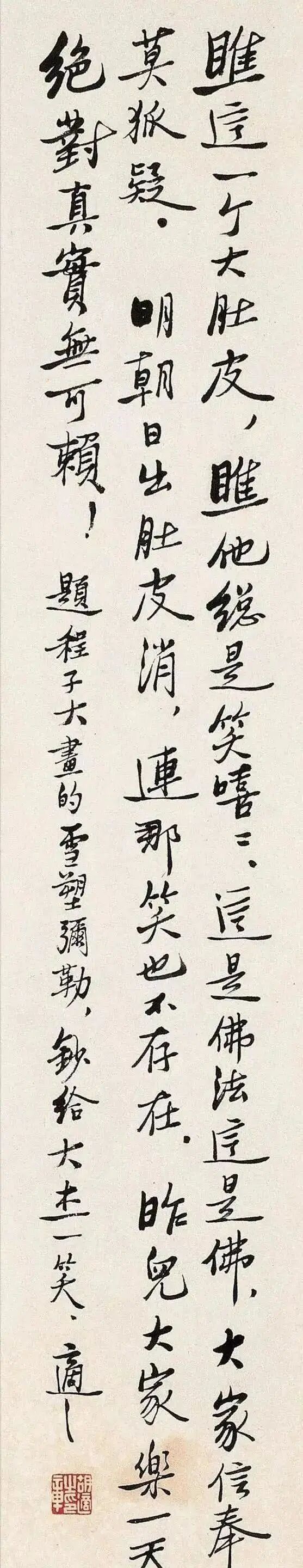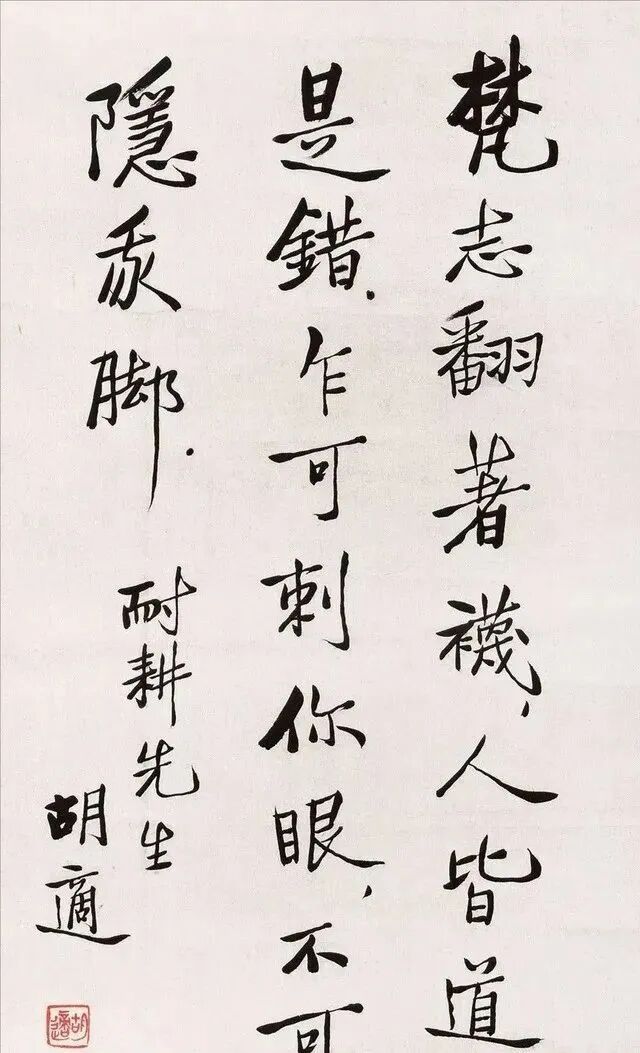 胡适的书法,在字形上,也非常有特点,能够让每一个字,都能够彰显出一种姿态之美,结构之妙,不少字写得相当方扁,给人一种踏实稳重之感,而有的字,却写得十分瘦长,彰显出一种高大的感觉,同时,也形成了明显的对比,这种对比,增强了视觉感受,让人眼前一亮,不仅如此,我们还发现,他的书法,还有一种碑的骨气,这一点也体现的淋漓尽致,从诸多特点上看,他的书法真是让人倍感清新,难怪不少朋友说道“他的书法自成高度”,也的确如此。
