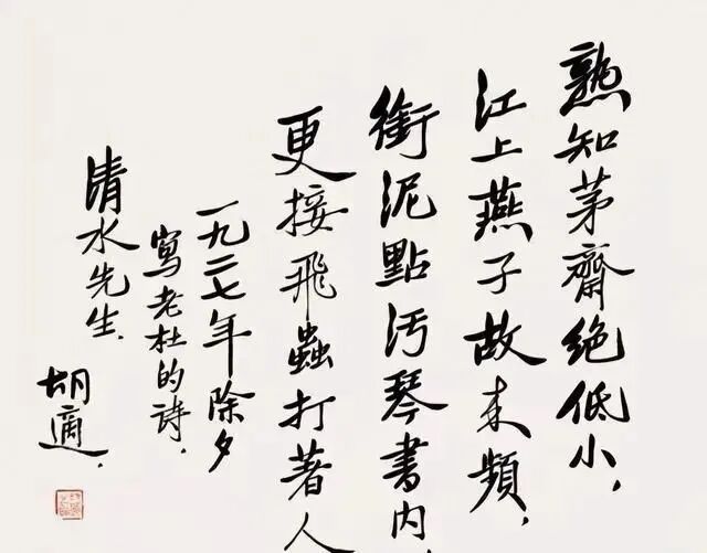 从胡适的书法作品上看,其书法非常有个性,十分鲜明,既有一种端庄大气之感,又有一种行书的飘逸姿态,的确让人眼前一亮,似乎还有一种长锋书写的态势,在造型上,呈现出一种字字倾斜的状态,虽然倾斜,但是倾而不倒,很有势感,势感强烈,这也许就是一种独到的认识,彰显出不一样的个性,同时,我们也注意到,他的书法,在浓淡对比上,表现的也是相当突出的,线条时而粗,时而细,即使一字之内,也有对比,对比很是强烈,相信这样的处理,也一定会惊艳到你的。
