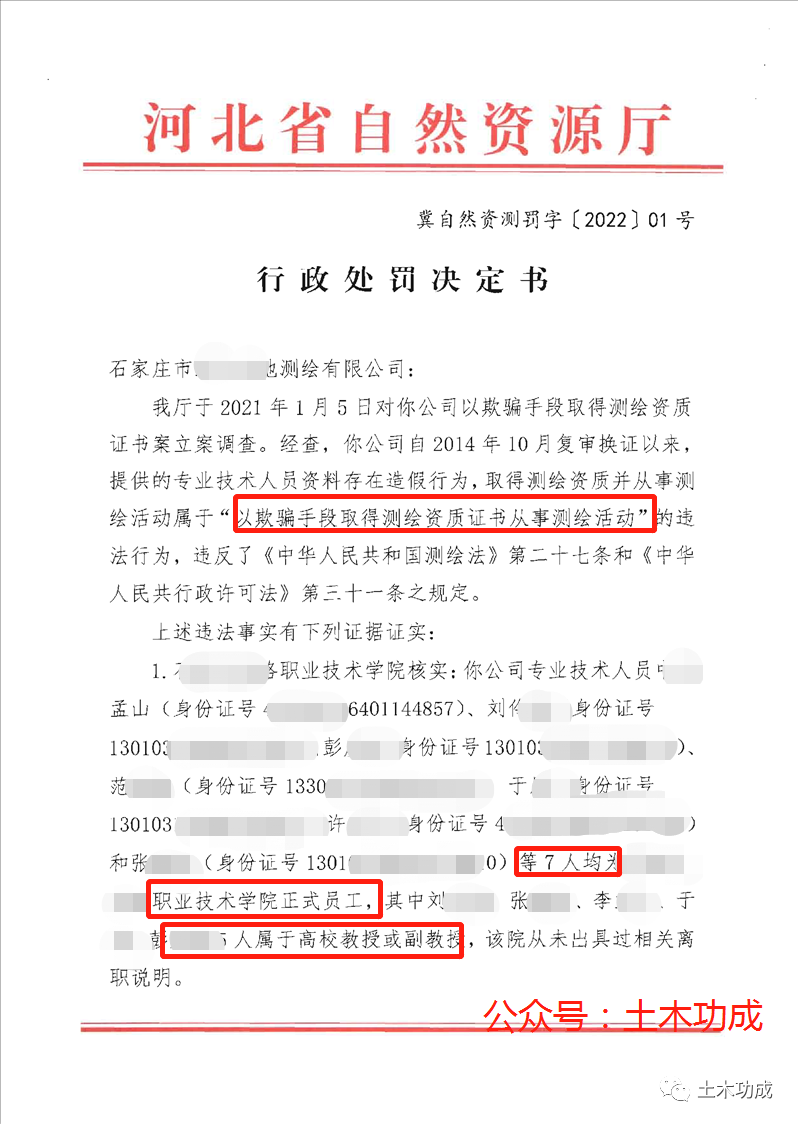 河北某测绘公司,2014年10月,在获取测绘资质过程中,存在以欺骗手段获取资质的行为。提供的专业技术人员资料存在造假行为,7人均为某技术职业学校的正式职工,其中5人为教授或副教授,该院从未出具过相关离职说明。最后省自然资源厅给出的处罚为: