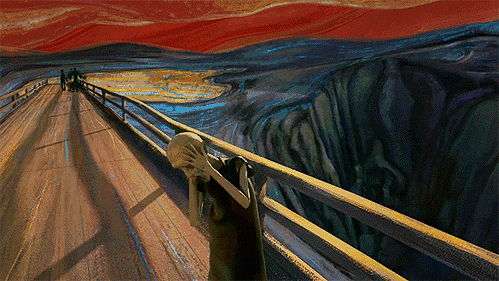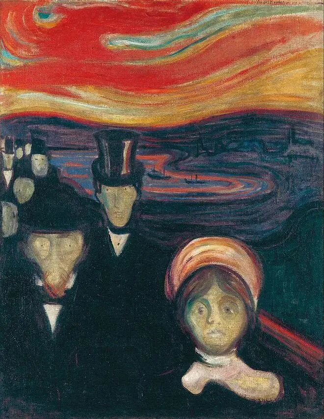 我和两个朋友一起漫步,夕阳西下。我感到一丝淡淡的忧郁。突然天空变得像血一样红。我止住脚步,斜倚栏杆,精疲力尽。我望着燃烧的云,血染般的红,象一把剑,垂悬在蓝黑色的深谷峡湾和城市的上方。朋友继续走着,我却停在那里因不安而颤抖,我忽然感到一声强烈的、永无止境的尖叫穿过宇宙。