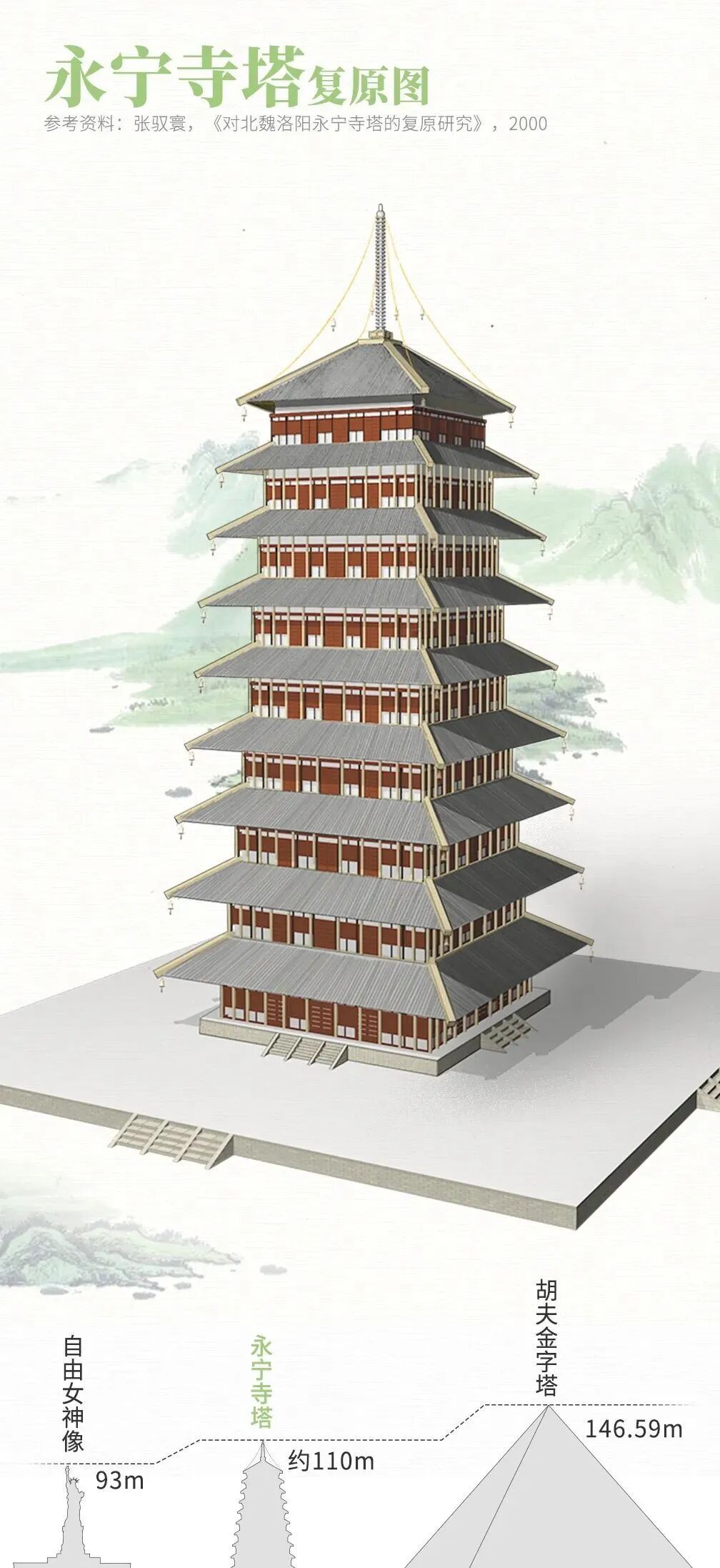 根据考古工作者的推断,永宁寺塔通高约110米,其高度已超越自由女神像,直逼胡夫金字塔,可以想见永宁寺塔的身姿当年是多么的挺拔巍峨 © 制图:陈随