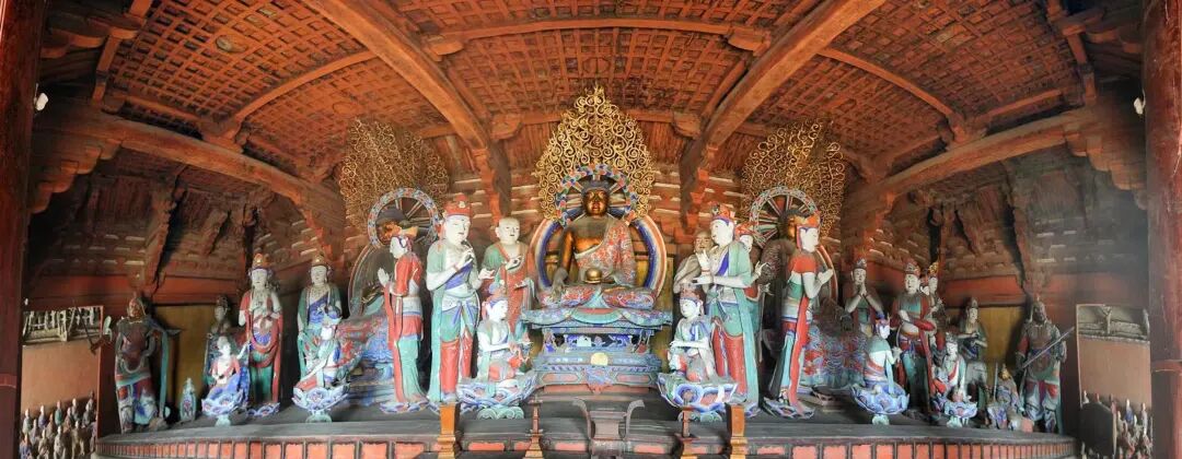 佛光寺,中国古代建筑第一瑰宝。大殿仍完好保留了1100年前的样子并成为我国现存唯一的唐代殿堂式木结构建筑。与粗犷的外表形成对比的是大殿内部丰富多元的艺术珍品,保存有唐代塑像35尊、明代塑像296尊,神态各异、气势磅礴。此外还有唐代壁画60多平方米,各时期题记、碑刻、经幢等 © 制图|张靖 图片| 谢禹涵