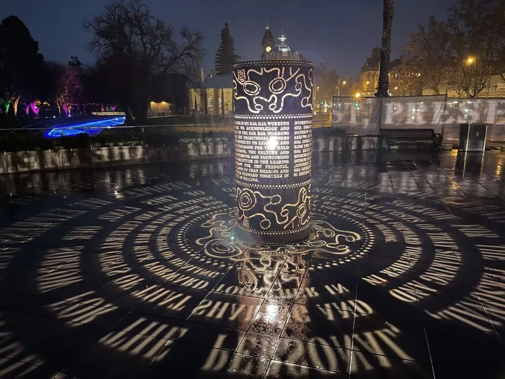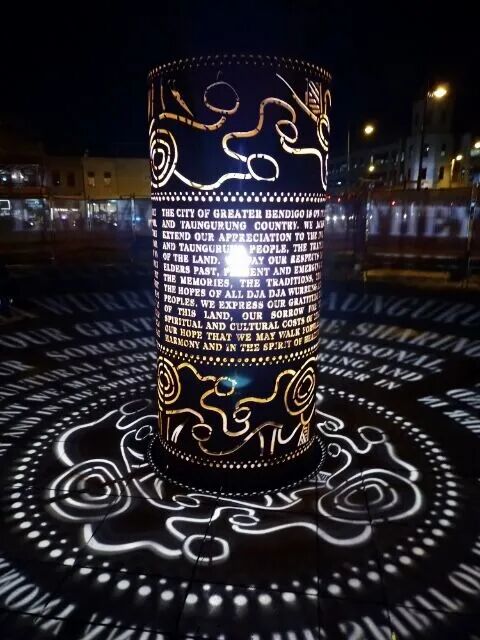 以当地的土著民文化作为创作灵感,Laservision Mega Media在园区中心设计了一座灯光雕塑,当含有特殊意义的图腾与文字透过灯光雕塑被投射在地面时,本迪戈这座城市的过往也随之一一展现给游客。