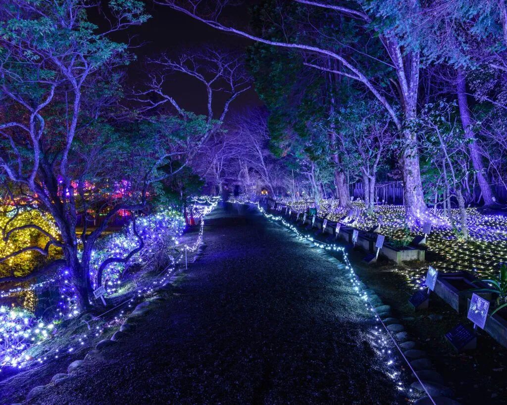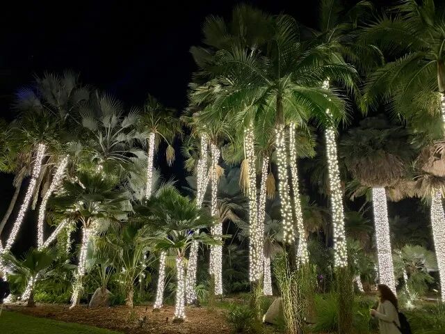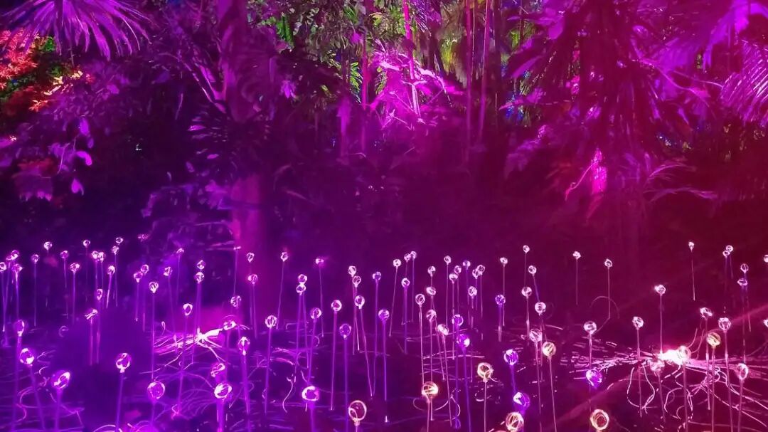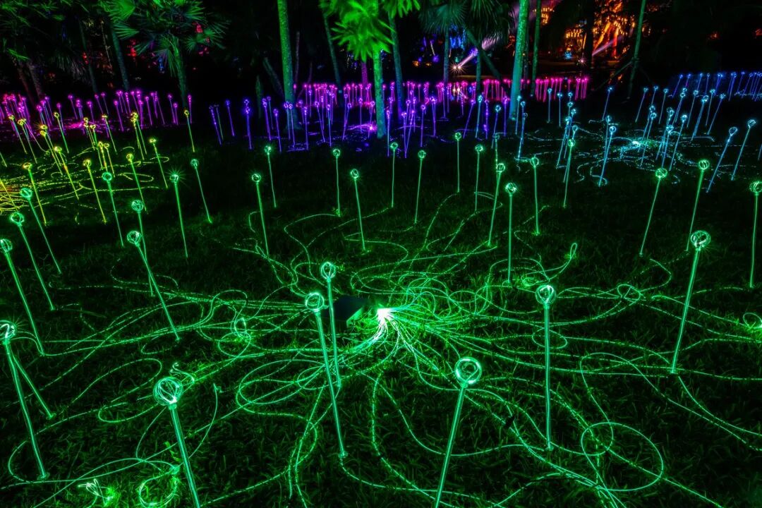 在植物园广阔的环境下,与灯光设备融为一体的棕榈树、苏铁植物、攀缘植物等热带植物展现出不一样的生命力,为游客打造了与众不同的自然景观。