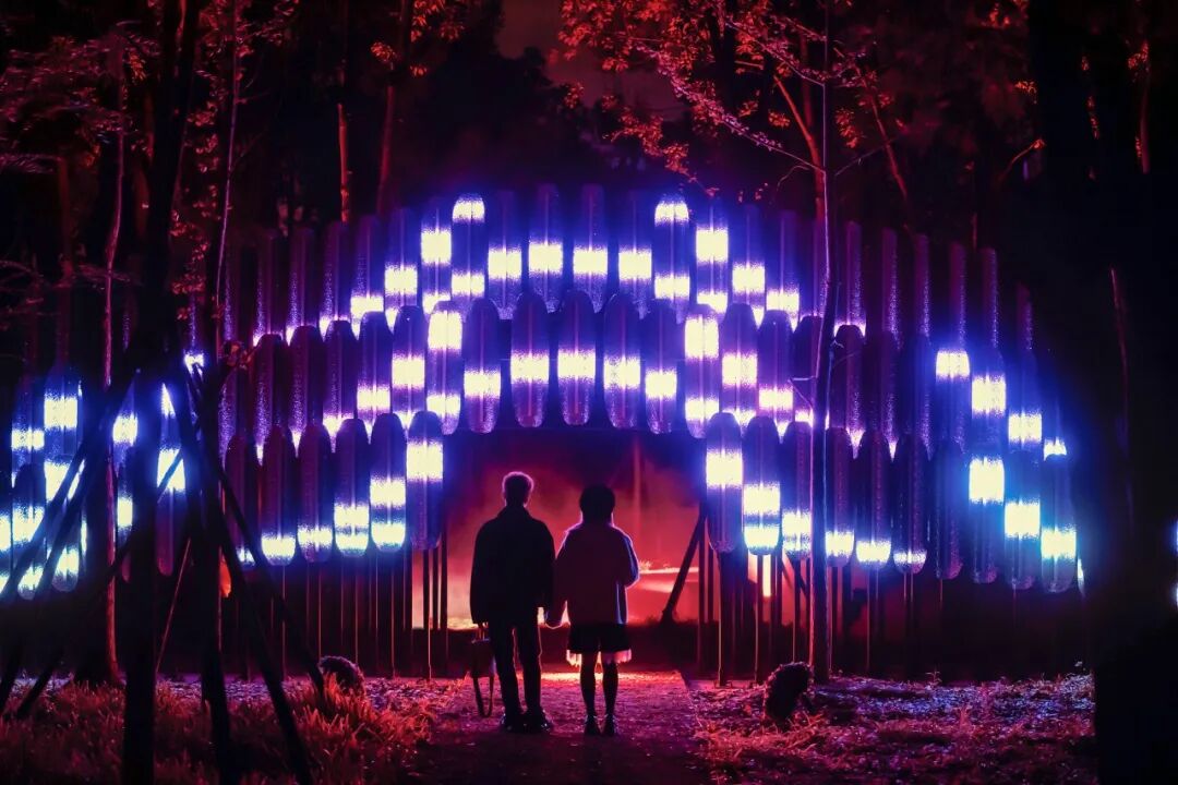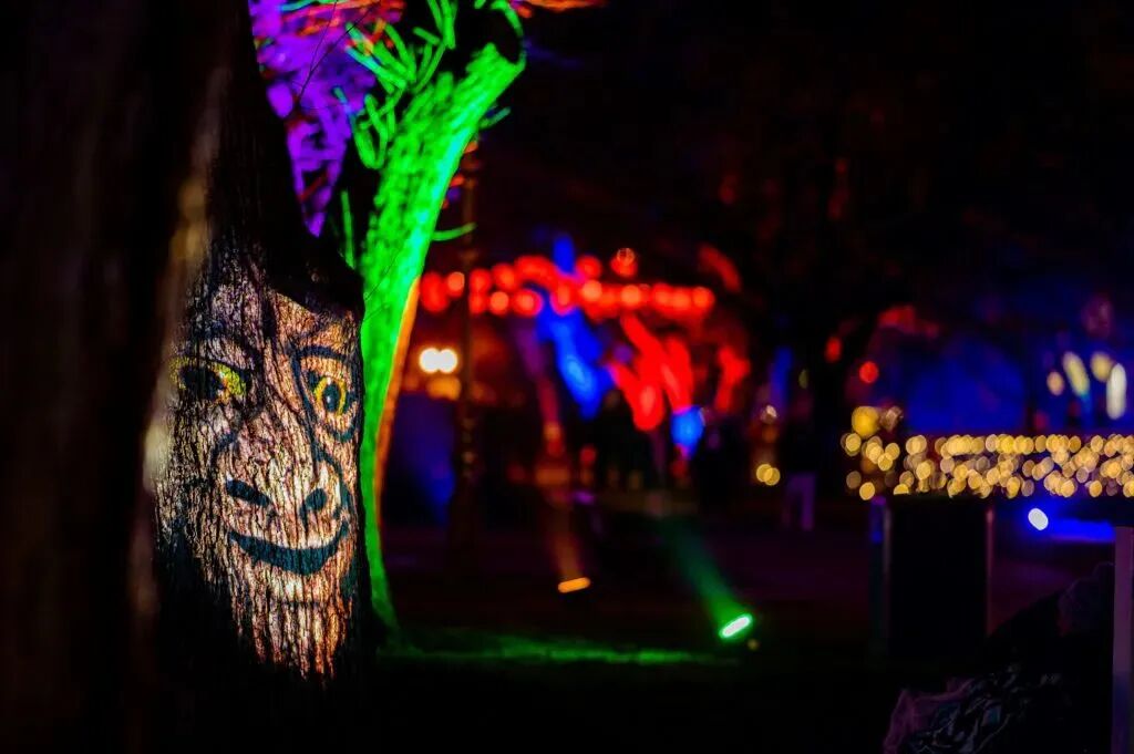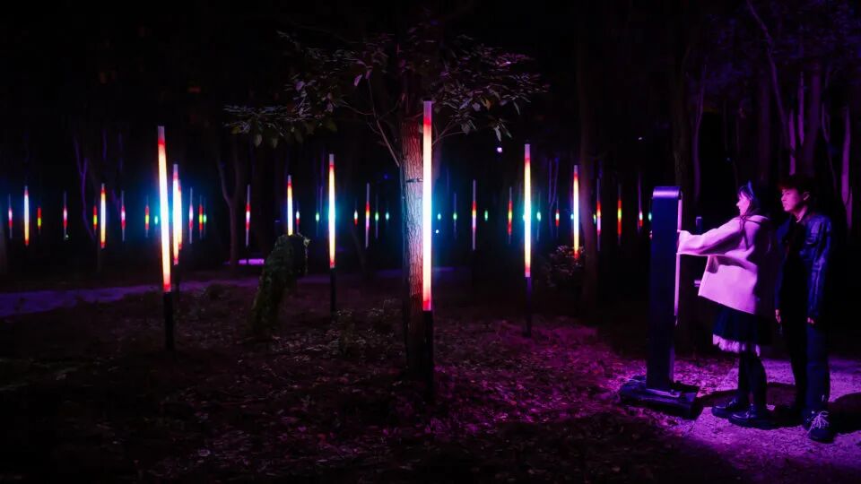 五彩斑斓的灯光照射在林间小路,为现场构建了一道“夜间彩虹”,同时给游客营造了一种浪漫奇幻的现场氛围。