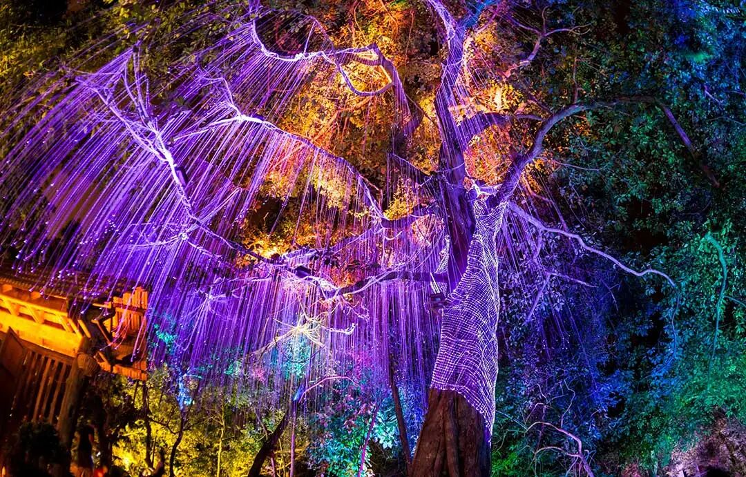 林间配备了1200多盏照明灯具以及21种不同的灯光装置,再加上树枝间悬挂的上百盏LED灯管,带领游客走进一个灯光交错的光影世界,丰富了游客的视觉体验。