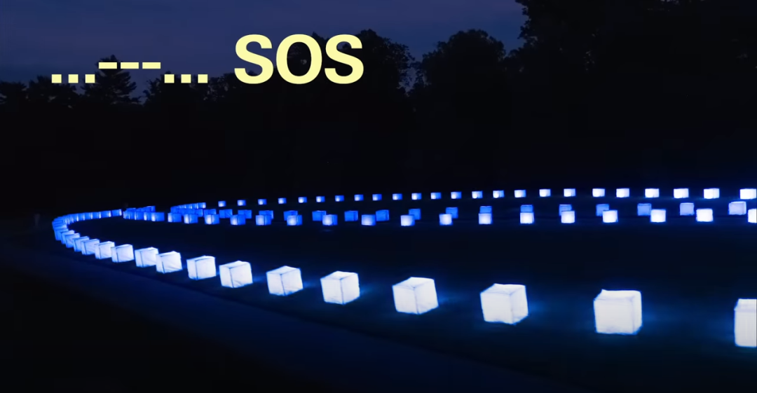 162个正方体灯光装置被以相同的间距安放在户外草坪,形成一条蜿蜒小路,由于在整体设计上形似摩斯密码,于是布鲁斯把它命名为“SOS”装置。当游客置身其中时,犹如在“灯墙迷宫”中行走,大大加深了游玩的体验感。