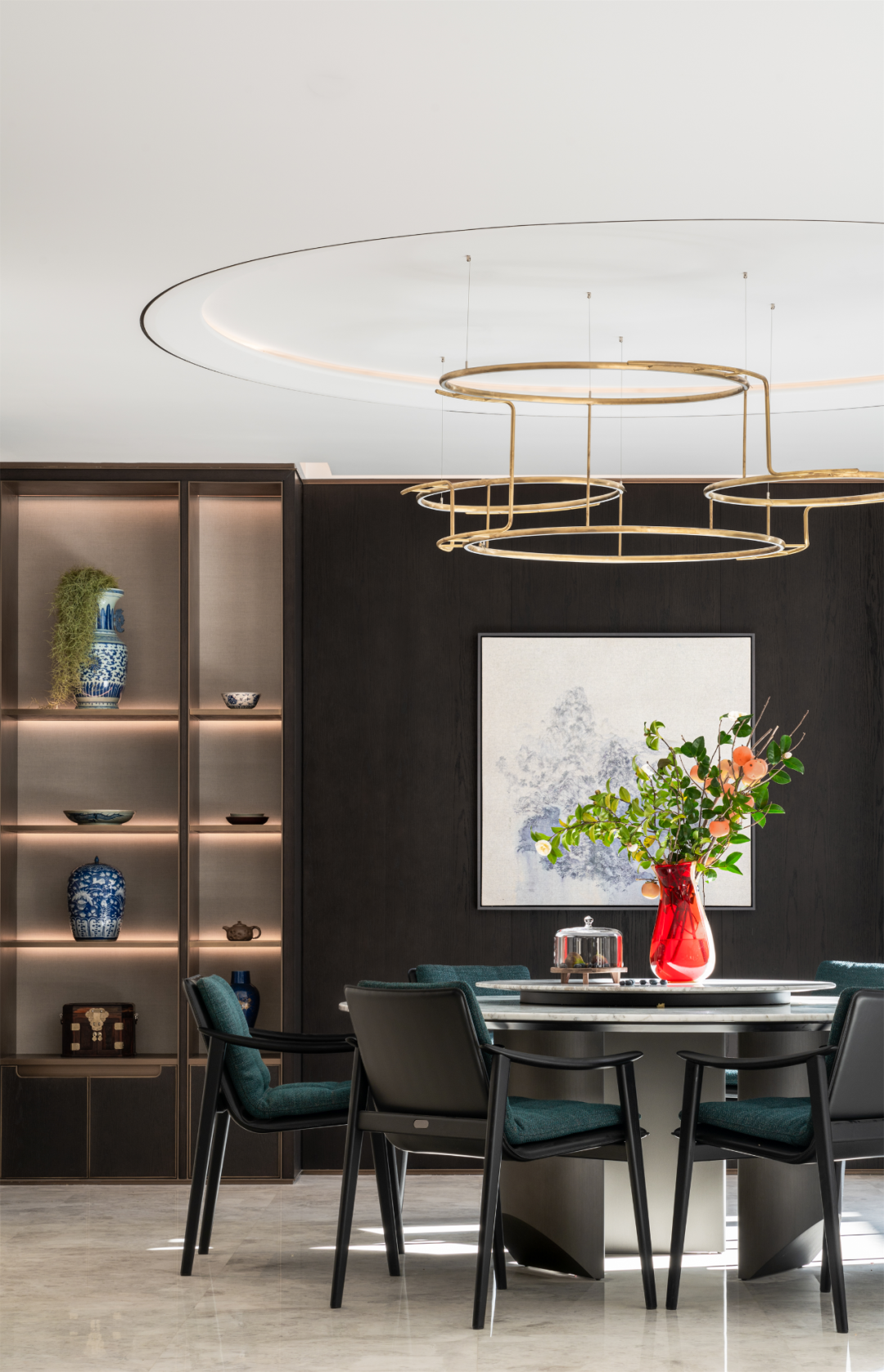 烹饪享食间,予人艺术联结与审美熏陶。以多样的展陈方式提升餐厅格调,现代手法表现的水墨画作为东方元素延续于此,圆弧与方正对话,加以多样灯光的点缀,无形中增添了时尚之感,唇齿留香,视觉盛宴。