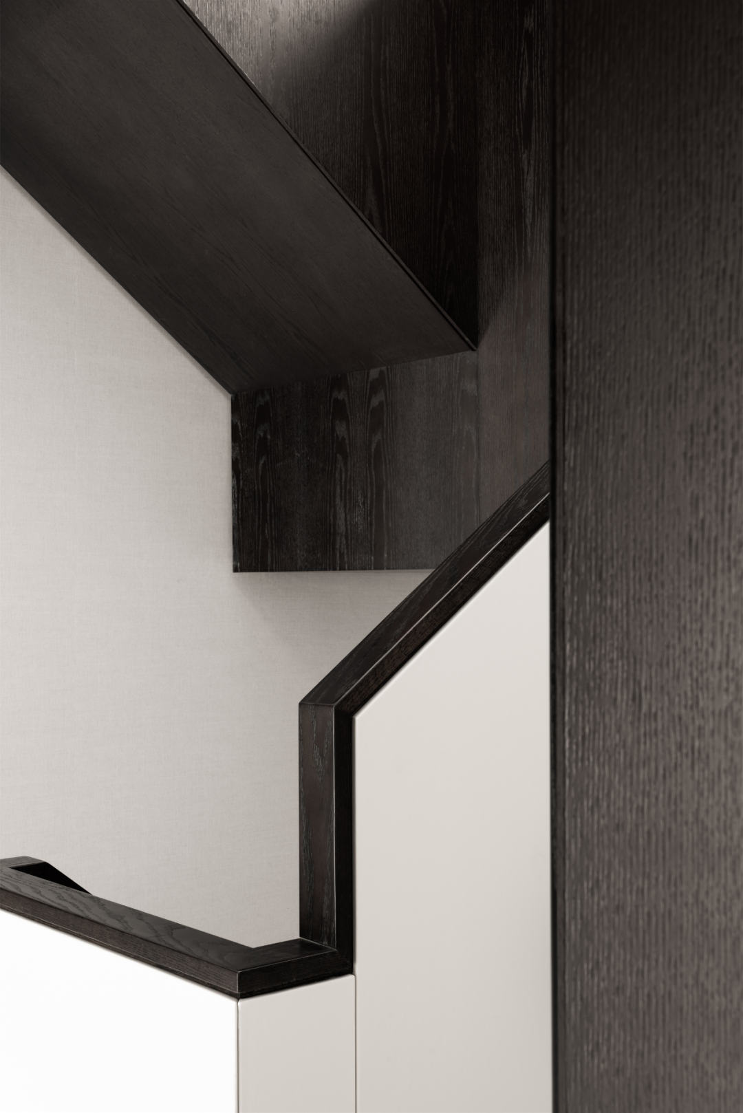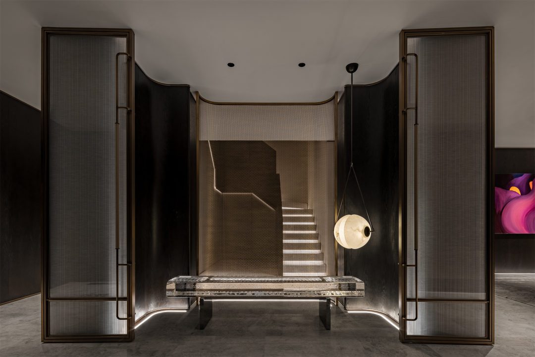 楼梯采用黑白色系的线条上下延伸,仿佛水墨流转,诠释出场域的关联与层次变化。