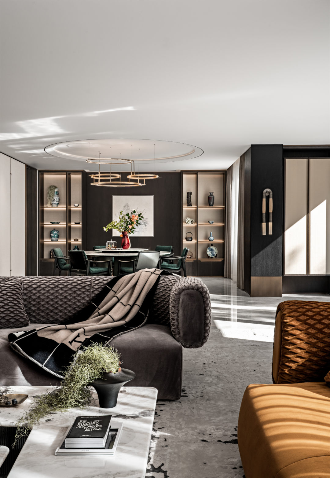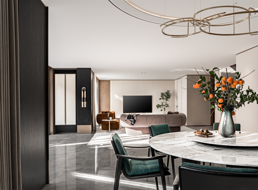 客厅摒弃繁冗,以素雅的基底,凸显材质与工艺本身。地毯的表现形式与大理石的肌理,呼应整体之余又演绎出多样层次,赋予居者丰富的感官体验。