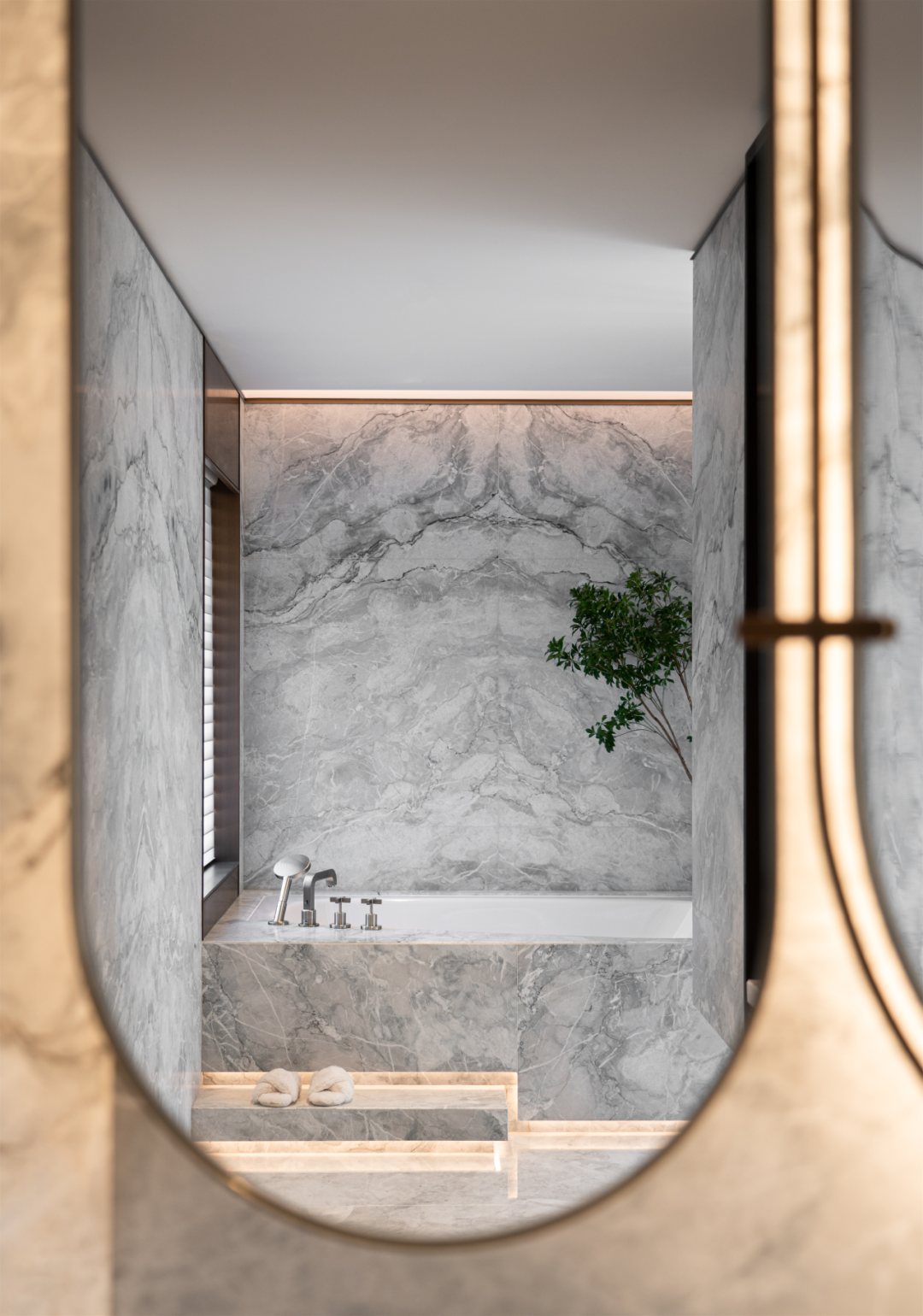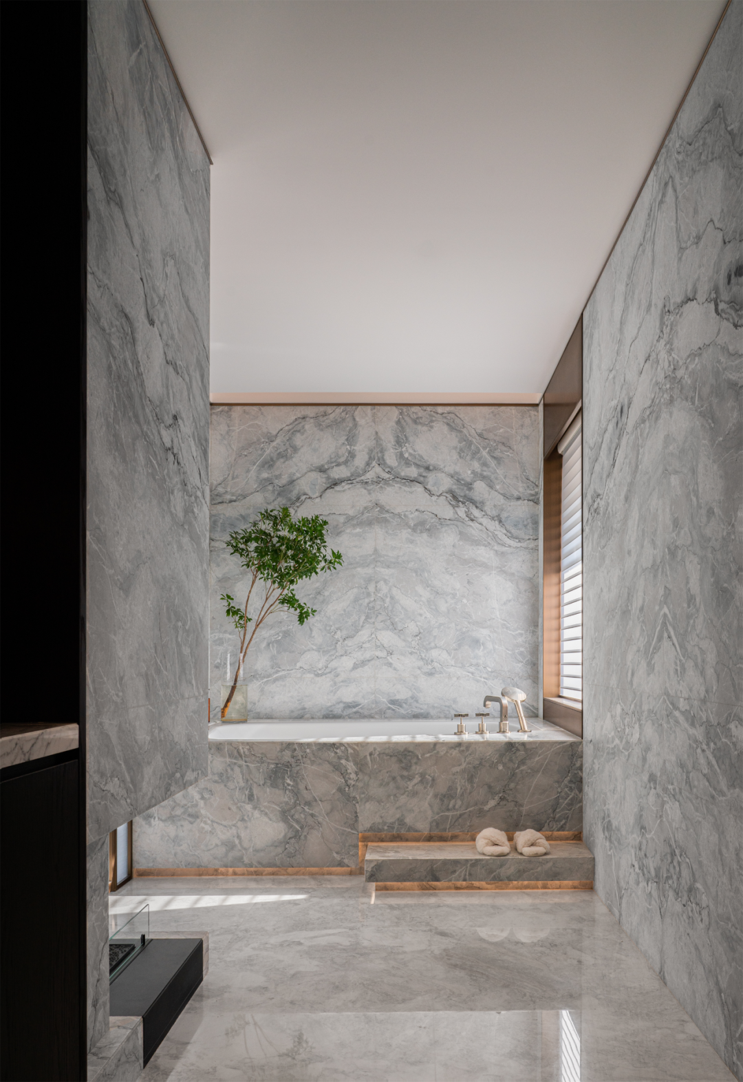 灵动、隽永的主卫,以大理石铺就,释放出温煦的自然之美,丰富的光感,舒适的视觉呈现,配合浴缸与壁炉的温馨打造,赋予更高品质与仪式感。
