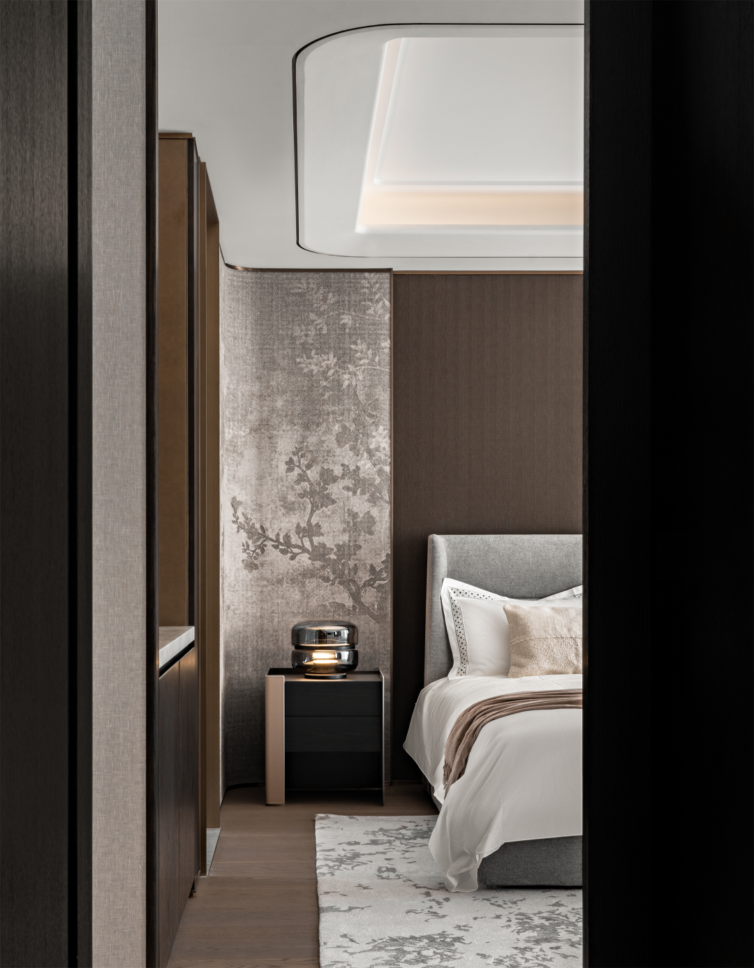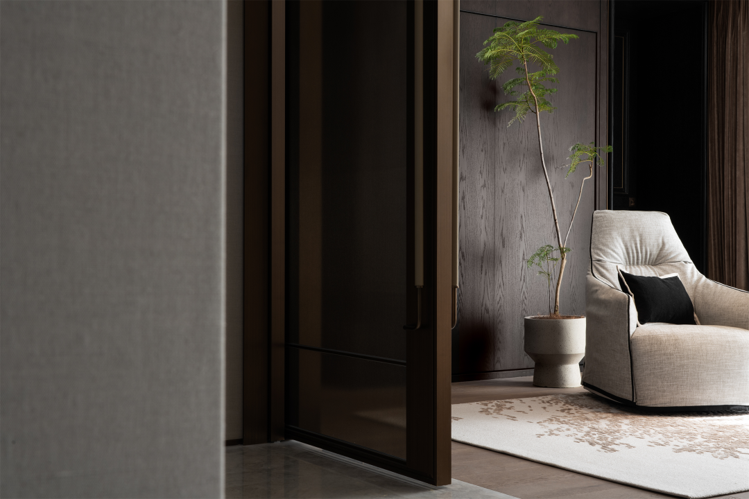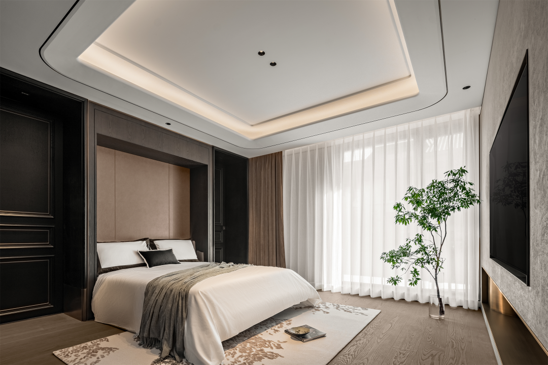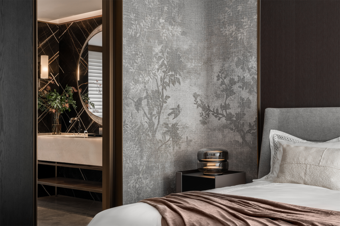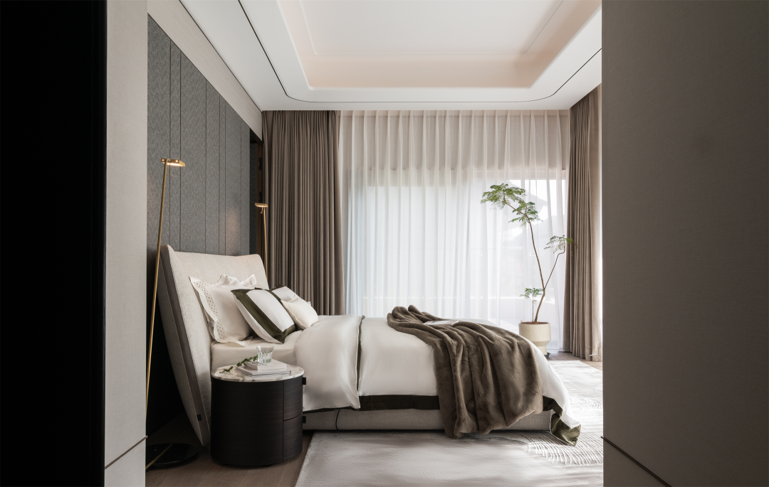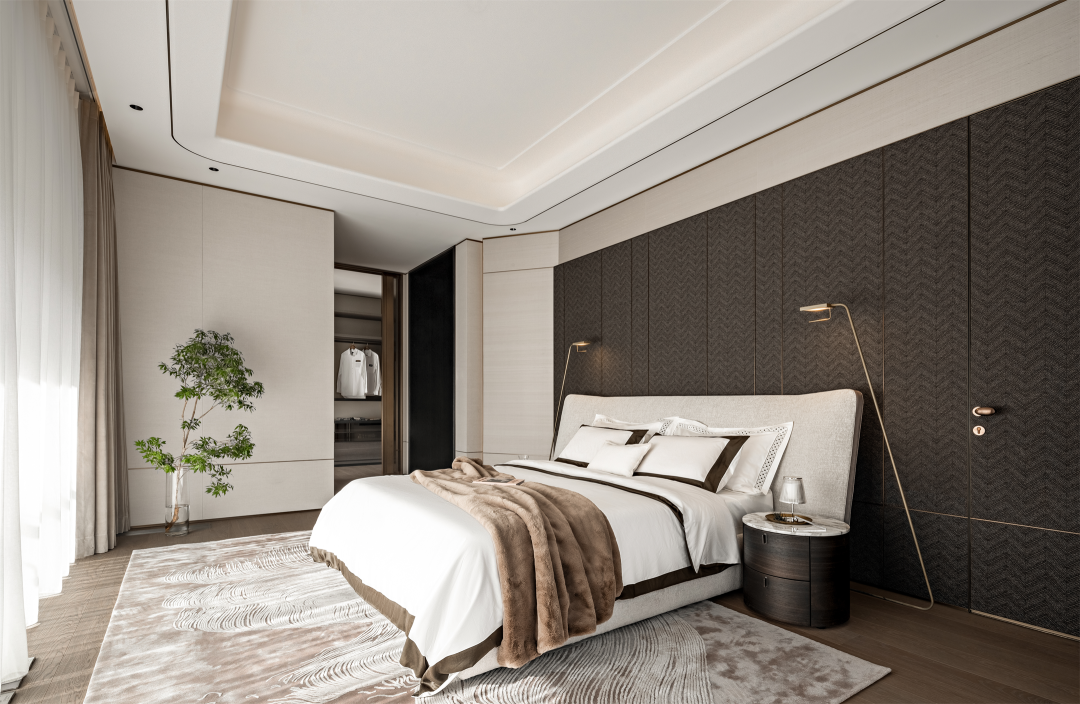 温润格调融合东方意蕴,多层灰度与咖色交织,舒缓的弧形与素净的材质碰撞,在老人房勾勒出几分闲适,呈现安然的理想状态。
