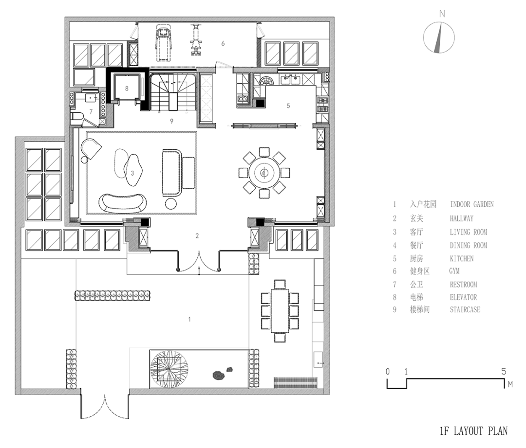 一层置入多元化的生活场景,规划出客厅、餐厅、中西厨及阳光健身房,室外增设绿植区和BBQ露台,行动坐卧、饮食起居,不放过每一个细节,以期还原最契合人居的休憩场所。