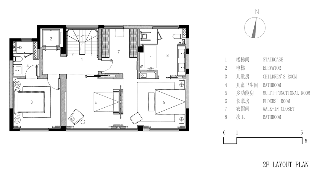 考虑到空间的多变性与时间延展性,于二层设置多功能房。可升降隐形床能实现不同需求下的功能转换,白天变身儿童娱乐区,夜晚则是保姆间,陪护幼儿起居。房间一侧巧设两扇门与老人房相连,互动性与私密性兼具。