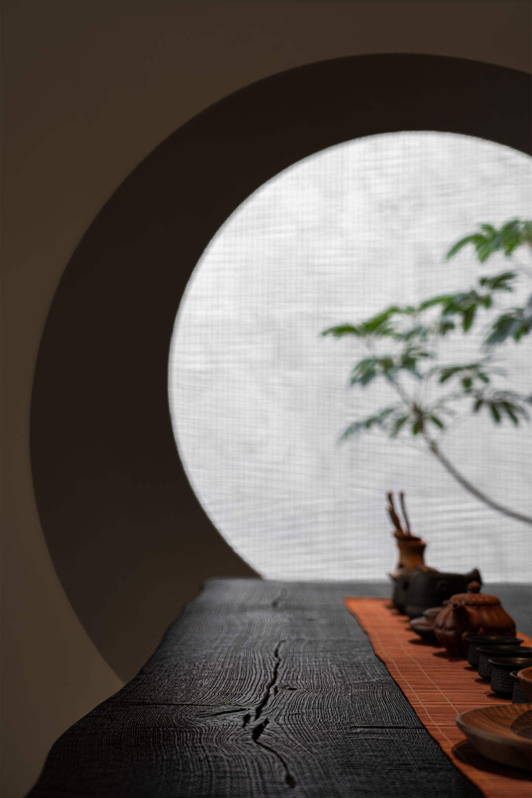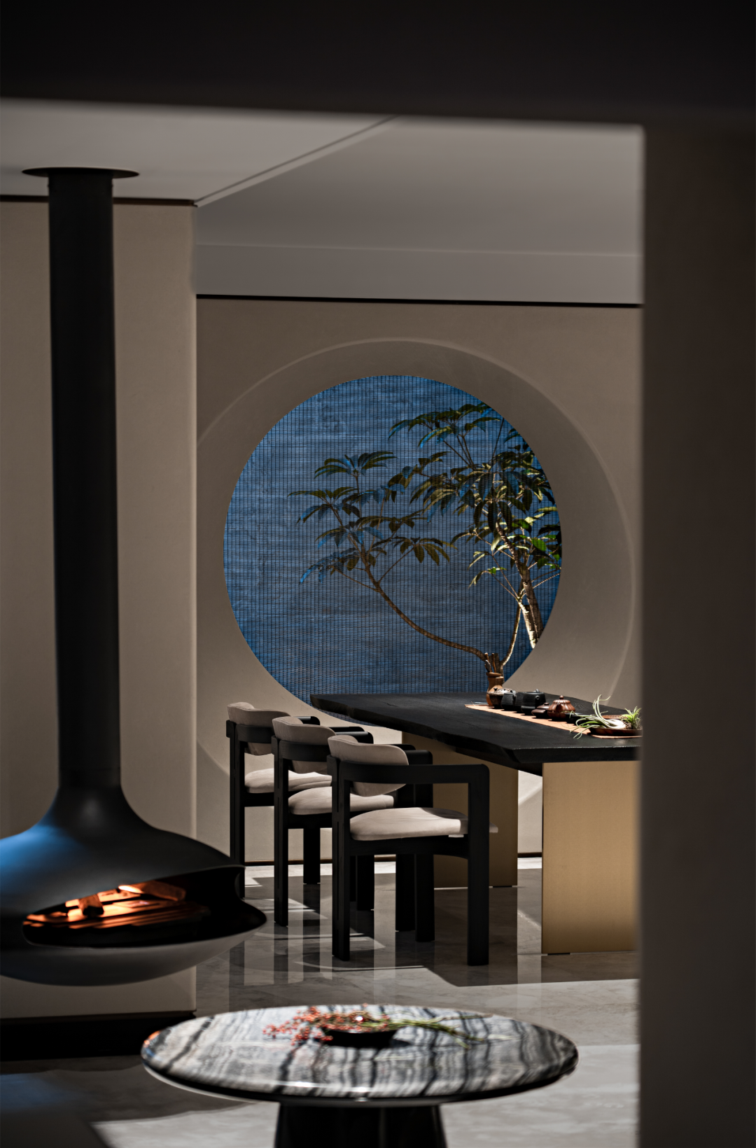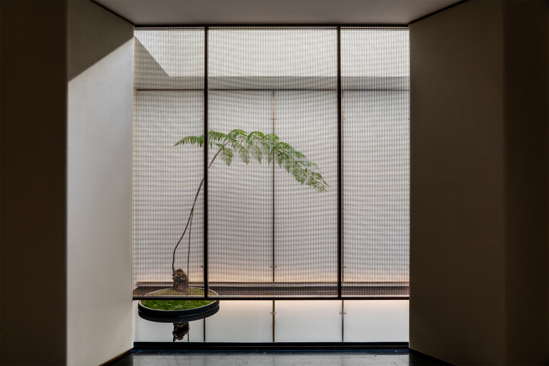 饮茶区采用建筑的开口设计,让方与圆相结合,呼应东方文化中的天圆地方。天窗的设置,便于将阳光引入室内,而洞口金属编织的屏风则起到些许遮挡作用,随着时间流逝,照射角度亦随之变化,光影似乎成了大自然的调色板,描绘出一幅幅趣味、温馨的画卷。