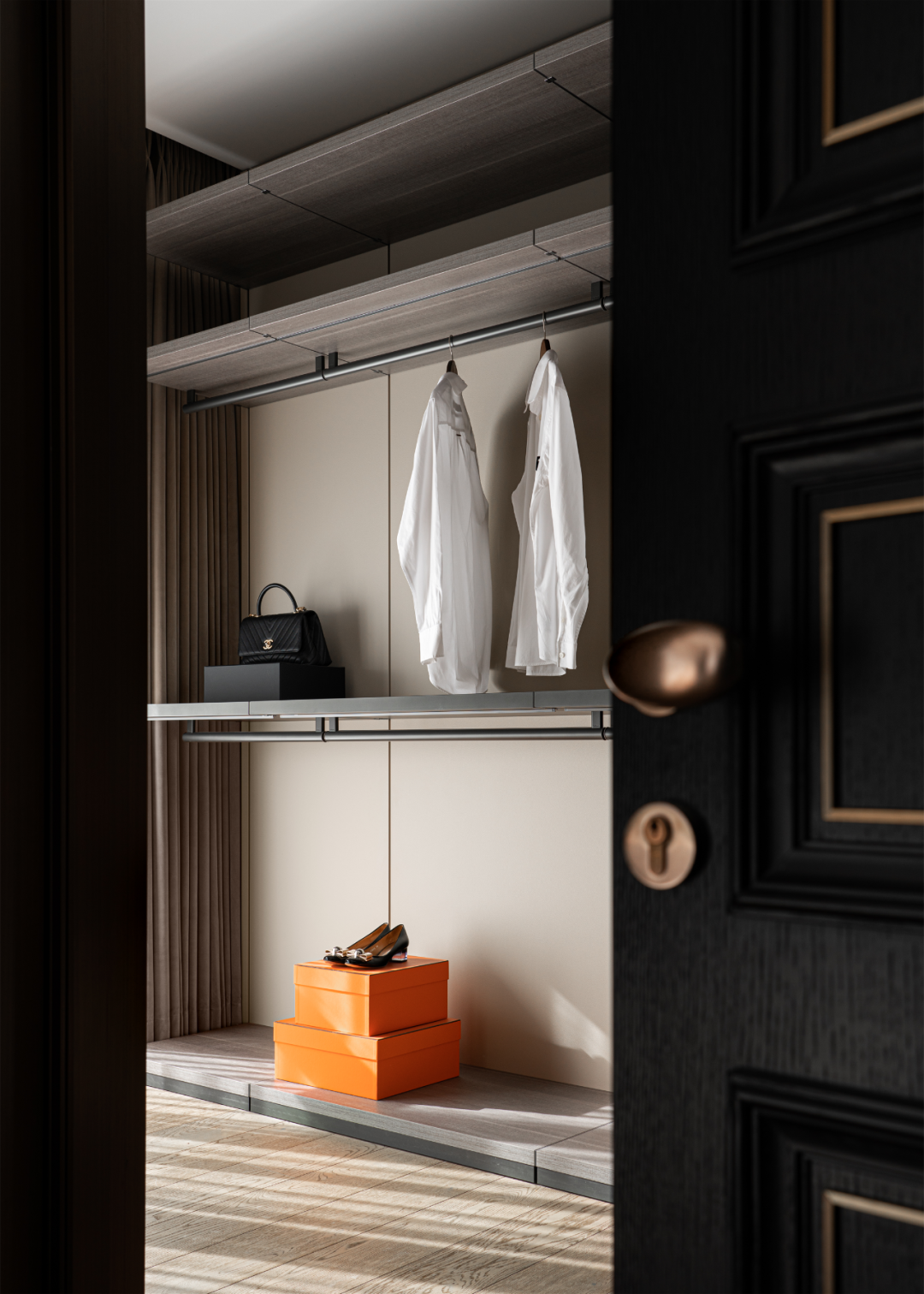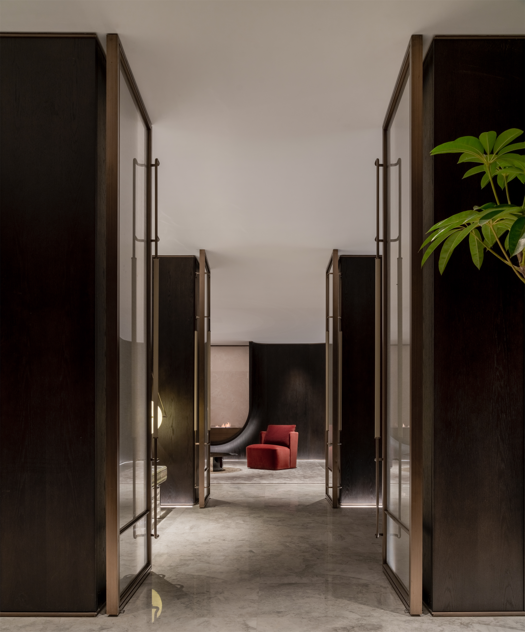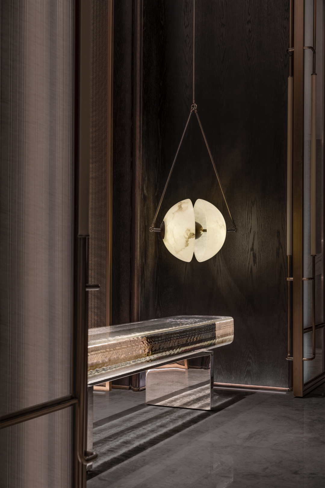 玄关似一座水晶宫殿,以四面通高的玻璃门,将内、外朦胧划分,渲染秘境之感。每组门的开合转换,可实现不同功能区的划分。围绕此而设的隐藏式储物柜,旨在满足居者不断增长的收纳需求。金属网勾勒出旋转而上的楼梯轮廓,令人心向往之。
