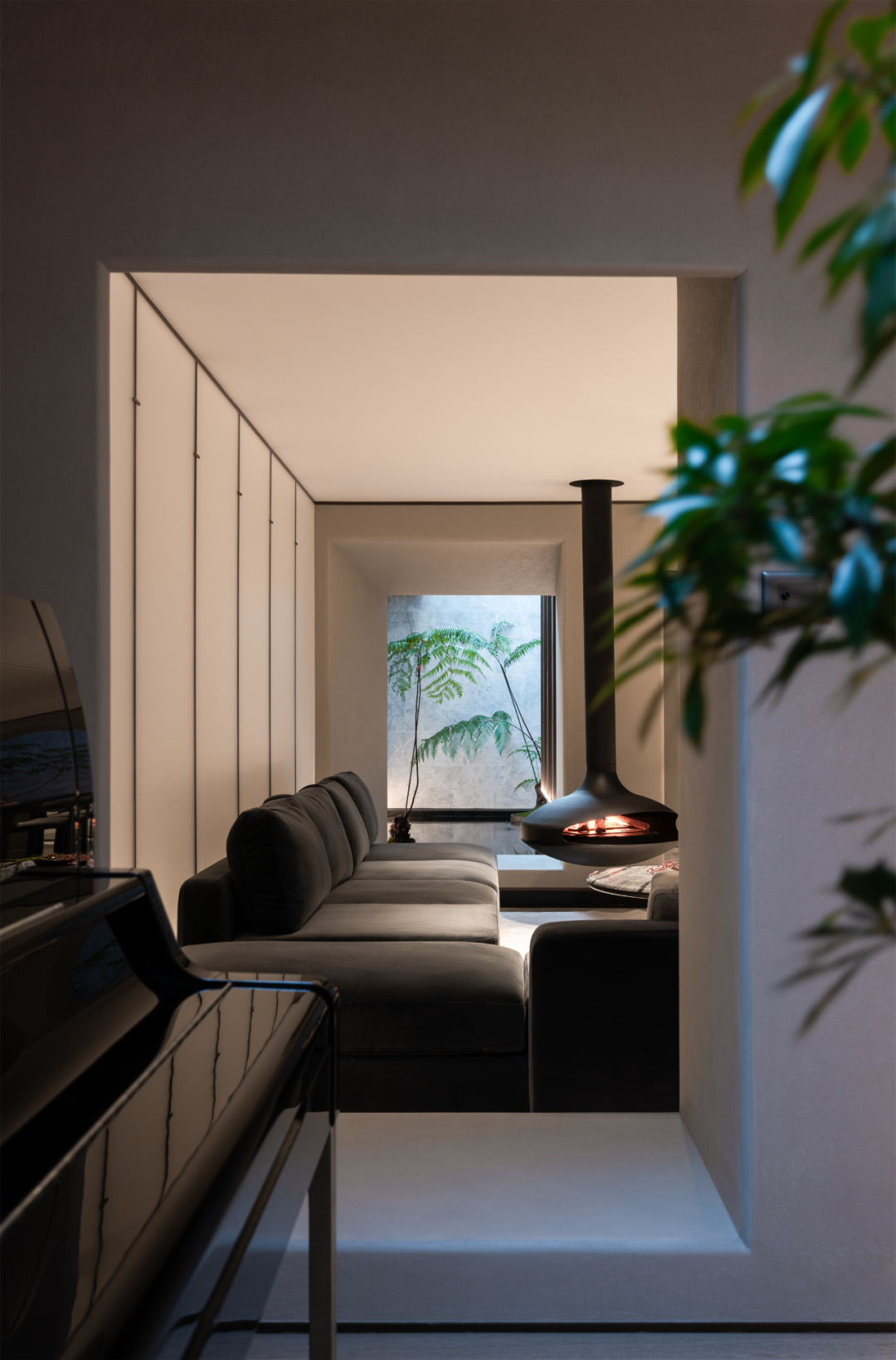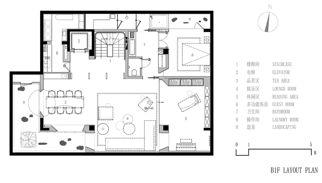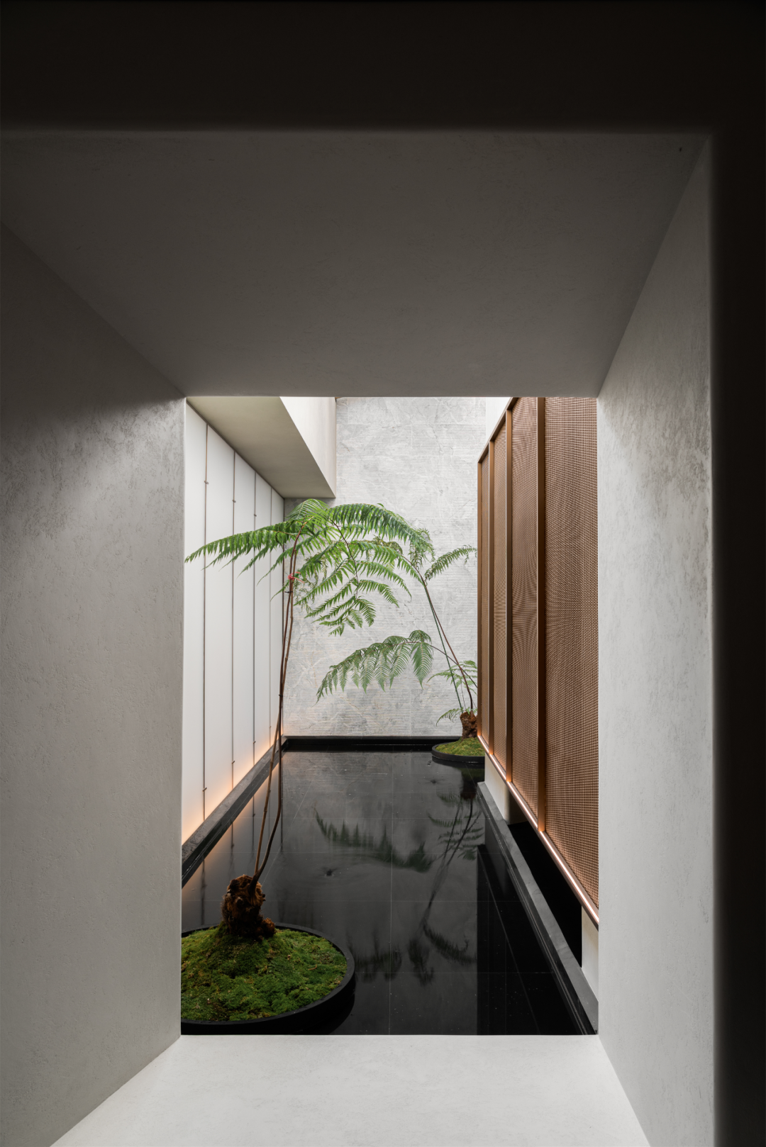 负一层别出心裁,以天井造一方生态小景,并灵活运用材质、线条、色彩与光影的变化,于此谱写出和谐的韵律之美。