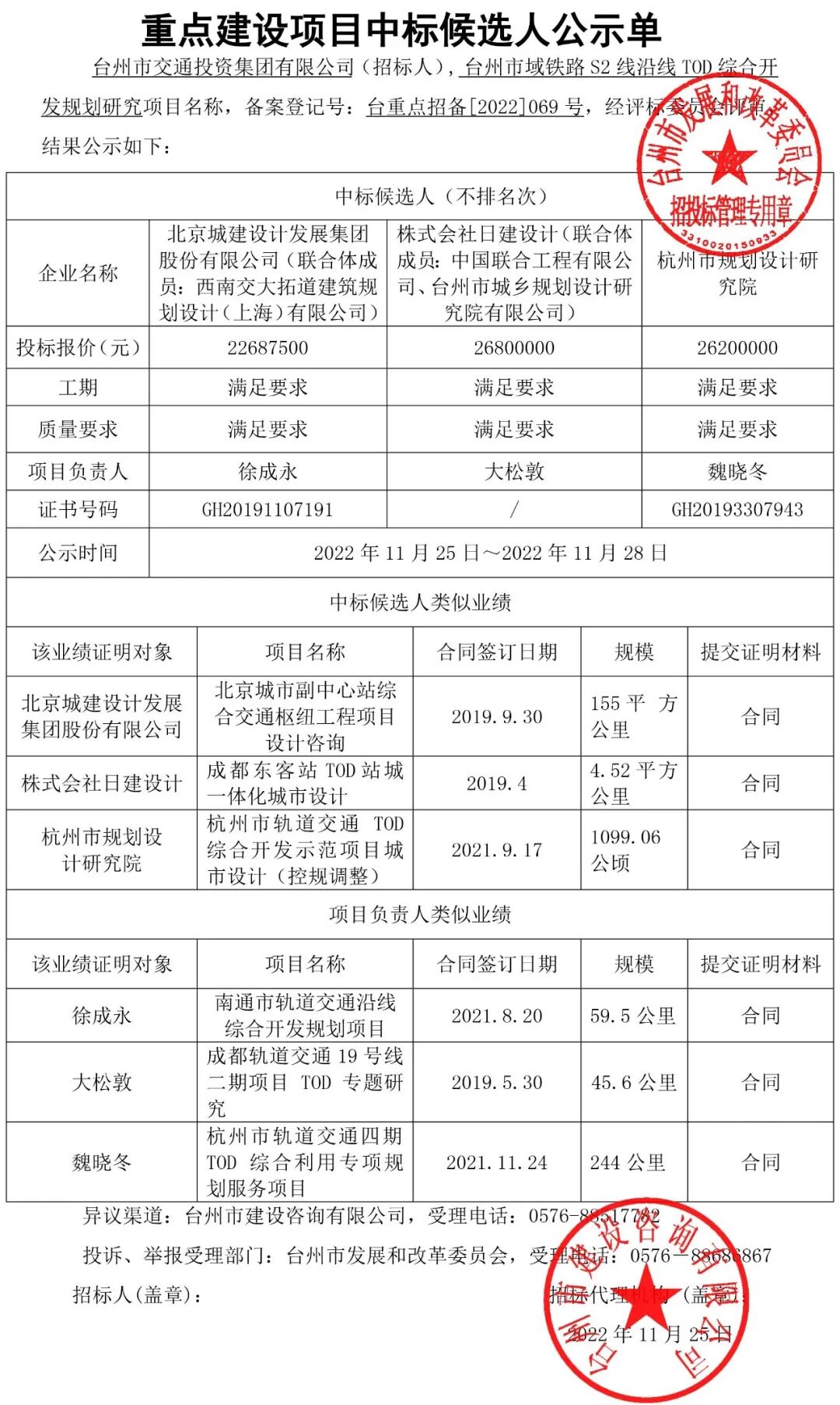 2022-11-25,台州市域铁路S2线沿线TOD综合开发规划研究开标并确定3家中标候选人,分别是: