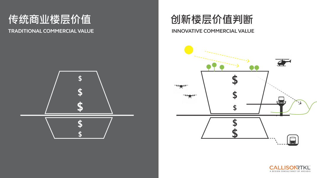 在谈到对于传统商业楼层价值的反思时,刘严提到,当更多与人们需求息息相关的功能被引入到高楼层和低楼层空间时,例如随着未来空中交通的出现,城市街道因此被垂直植入到各空间中形成完全立体的街区,那么商业楼层的价值表现是否也会因其空间价值的提升而被正向带动呢?刘严认为,基础设施的变革将会引发创新楼层价值的重判