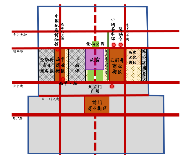 北京老城里的三大传统商圈及周边城市功能布局特征