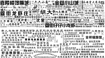 北京簋街(上)和颐和园路(下)在200米左右距离范围内的文字提取信息:字如其街。在我们身边一段200多米的街道上,大约写有800个汉字。按照人的平均阅读速度——每分钟300字计算,专注地读完这些文字需要近3分钟,而这也恰好是步行走过这段街道的时间。