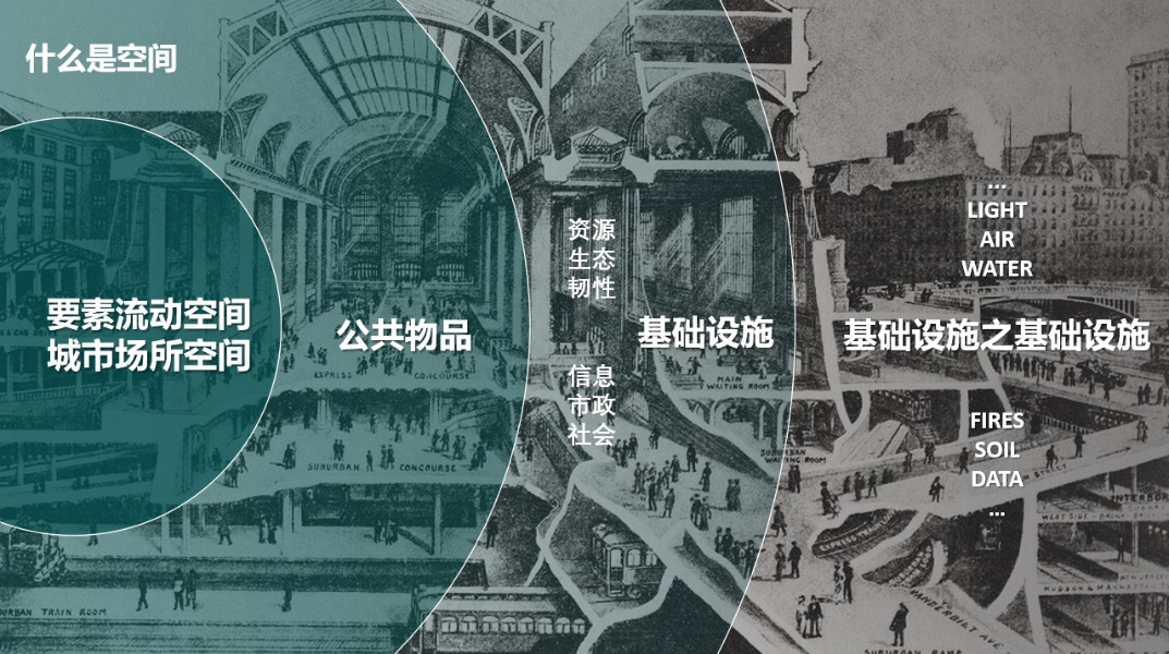 在演讲中,钱睿带领现场观众拆解了本次演讲主题的三个关键词,即“设计”、“需求端”、“空间”。以对“空间”的检索为切入点,钱睿认为,空间是基础设施本身以及其关联公共品所须占用的资源,包括自然资源、社会资源、容积和体积、质量、能源、技术等;其次,是承载包括土地、劳动、数据、技术、资本……各种生产要素自由流动的条件