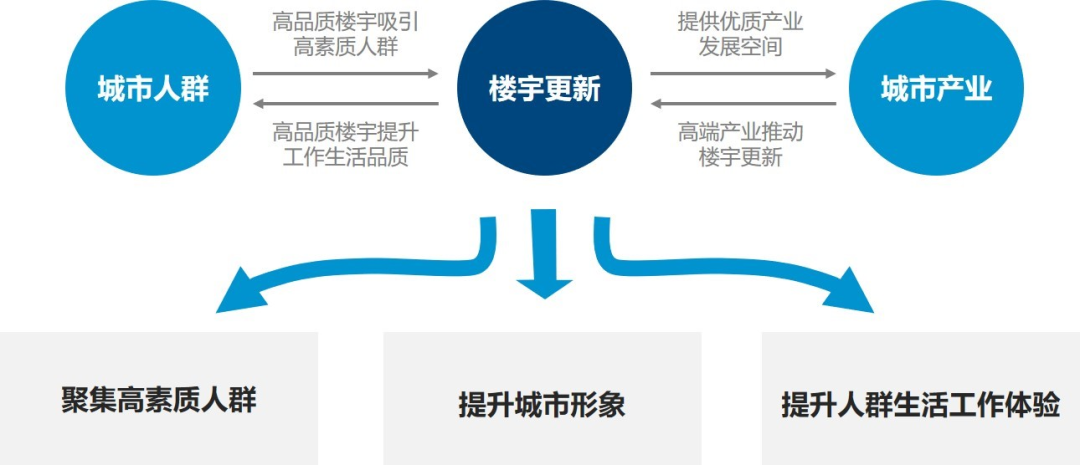 陈难说,“831”新政体现了城市更新所具备的三个核心价值,即社会经济价值、城市经济价值和资产经济价值。社会经济价值体现在产业升级和消费需求提升两大方面,最终的影响是在城市GDP、税收和就业方面的带动作用。城市经济价值体现在城市形象、居民幸福感和获得感、人口素质等方面。资产经济价值则更注重项目自身的再生价值,如楼宇再生价值。楼宇更新不仅能为产业提供更优质的发展空间,还可以吸引高素质人才,提升城市产业聚集效应。可以说,楼宇更新是城市发展和人口聚集的重要抓手,楼宇一边承载着产业发展,一边服务着办公人群。从这个角度来讲,楼宇改造的标准并不是越高越好,应该更注重市场和客户需求。