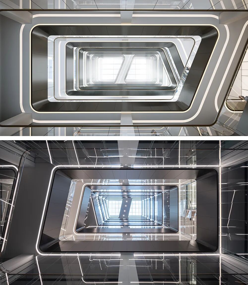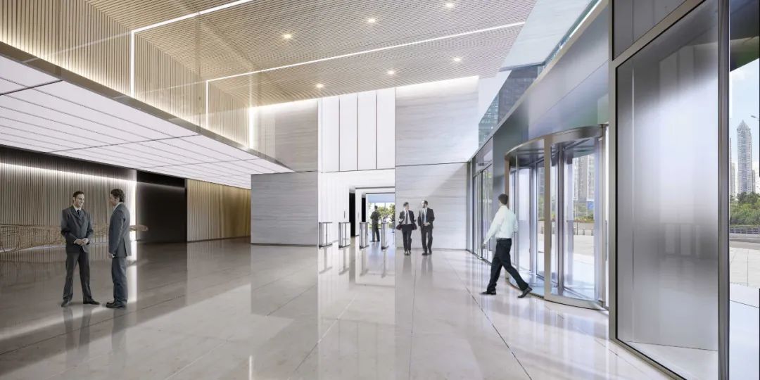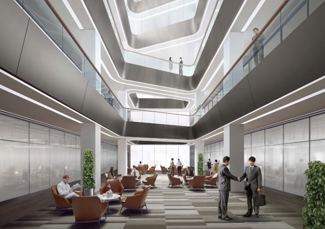 室内空间着力营造舒适宜人的办公环境。建筑首层采用双大堂的形式,西大堂衔接复兴门地铁方向人流,东大堂衔接金融街及央行方向人流,提高可达性与便捷性。二至十层设有挑空中庭,并局部设置了架空连桥,搭配屋顶天窗,形成通透明亮的室内空间,倾泻而下的阳光,模糊了室内外界限。同时,设计打造了包含屋顶花园在内的多处绿色空间,营造出人与自然共生的舒适办公环境。