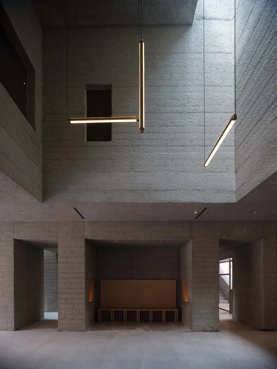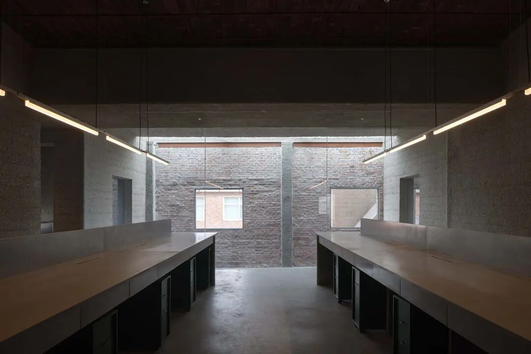 在浇筑的混凝土固化成型后,工匠使用凿锤细致雕琢打磨,塑造出更为柔和的质感。既与旧砖形成对比,又相得益彰。时不时,混凝土“渗出”至建筑外立面上,或填补了旧砖墙的空缺,或勾勒了开口。新旧结构之间的间质空间则被设计为咖啡厅和多功能空间。