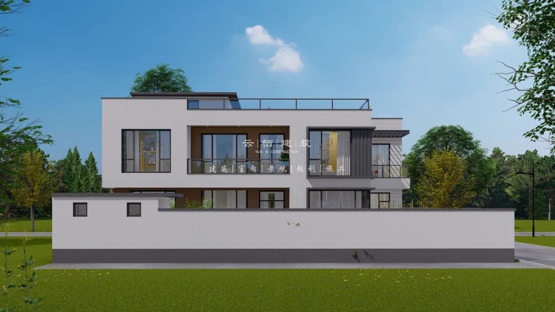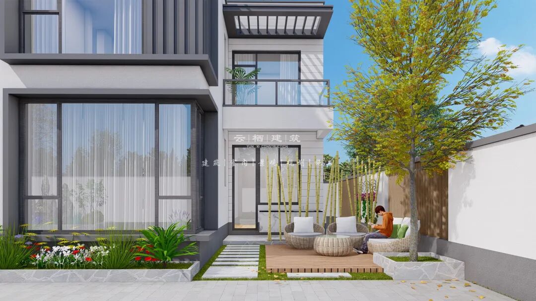 立面通过空间上各种出挑和进退关系,形成了丰富的体块,再赋予木饰板、防腐木,白墙、灰色铝合金门窗等不同的材质。整个立面现代简约,干练而不失艺术气息,从骨子里透出一副卓尔不群的气质。