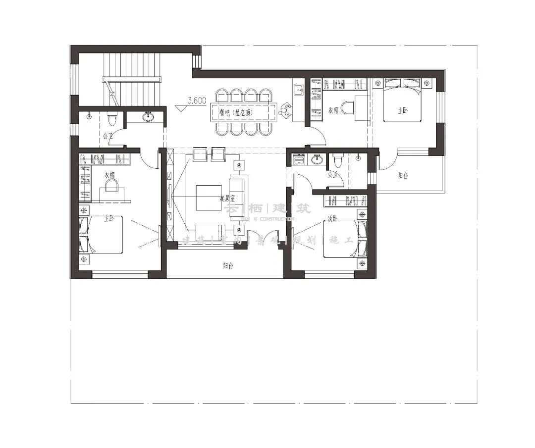 一层以公共空间为主,设置了客厅、茶厅、餐厅、厨房、长辈房及室外聚会平台等空间。家庭成员可以聚集在一楼,吃晚餐,看电影,甚至让一些朋友来一起享受这一刻。这一层是一个开放的空间,没有那么多的隔板。