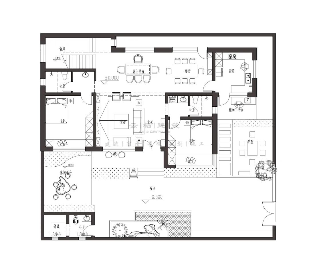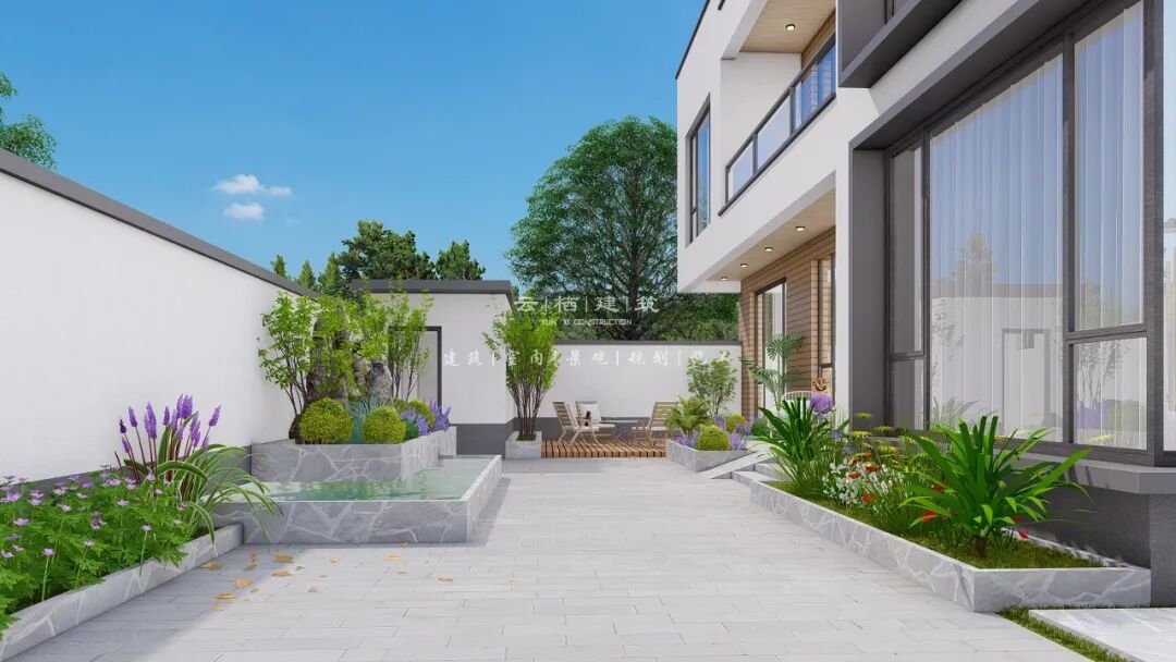 在建筑体量的布局上我们将庭院成L型布局,推门而出,整个庭院空间通过硬质铺装区分出休闲区和交通流线。敞阔庭院给人一种自在而尊崇的体感,自在揽景,生活的立体感油然而生。