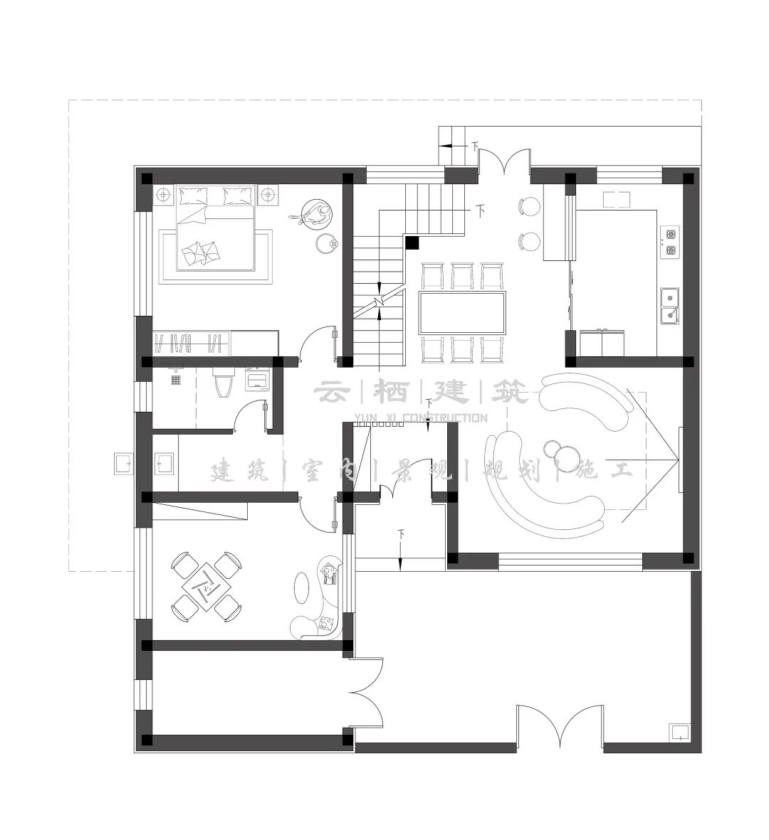 依据现场情况,将主入口放置在了东南侧,同时也是风水的最佳位置,东南内庭院用于缓冲人流,内凹式门厅设计,解决了入户雨棚的问题。